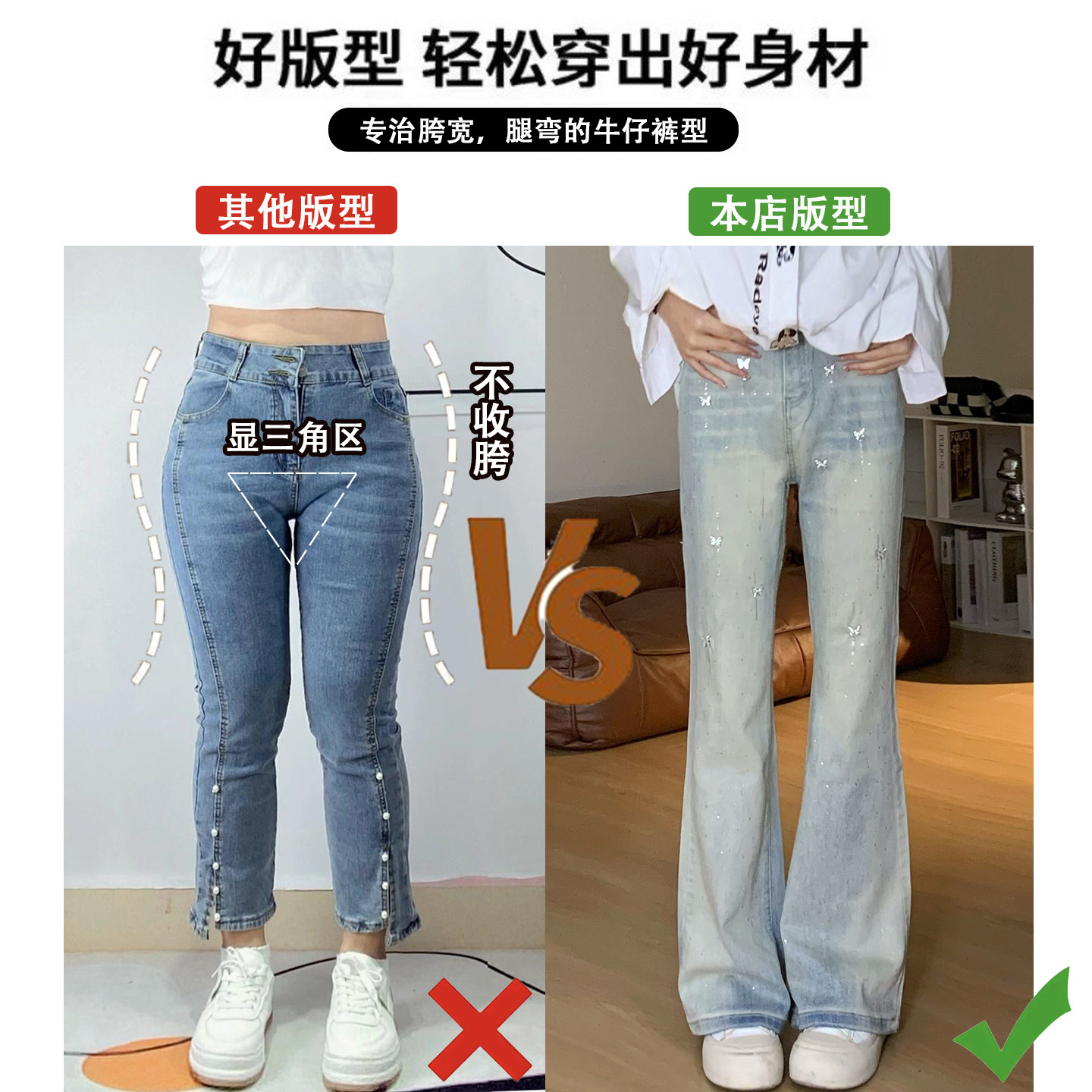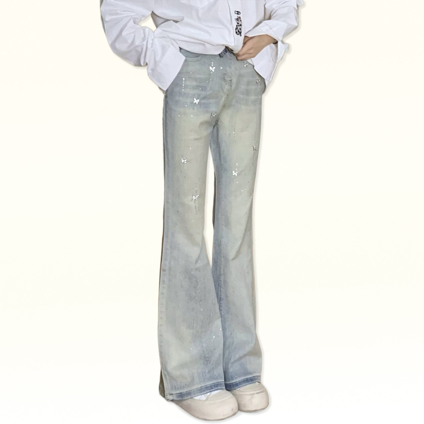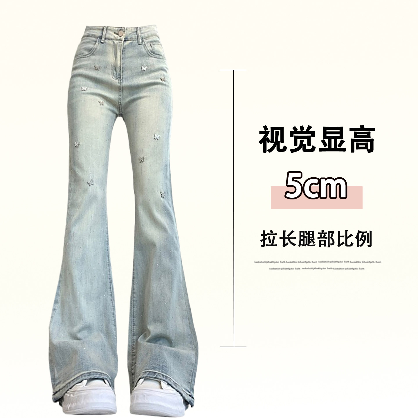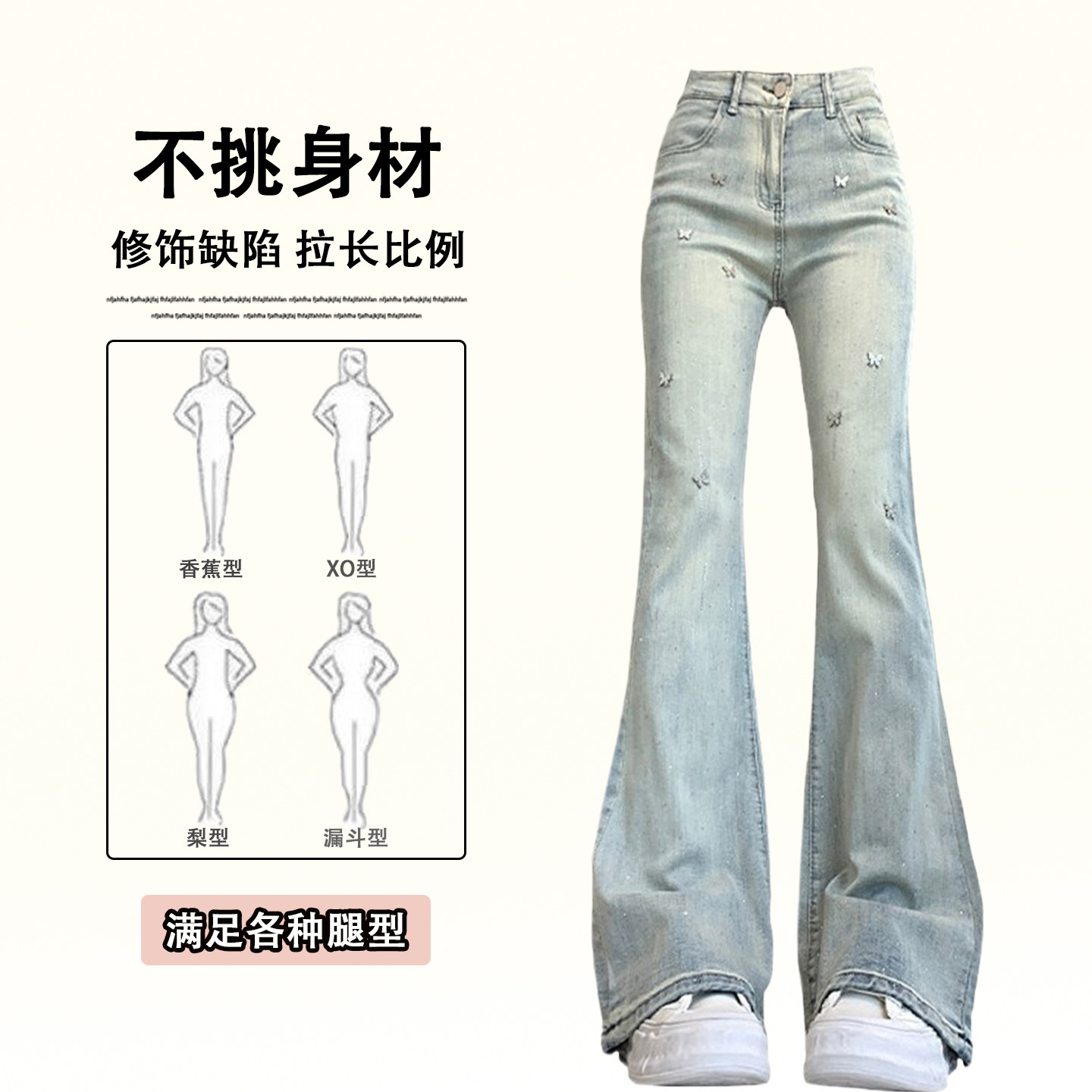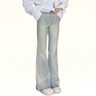 设计感小众高街微喇裤 女2026新款 子 胖mm蓝色蝴蝶烫钻牛仔裤 特大码