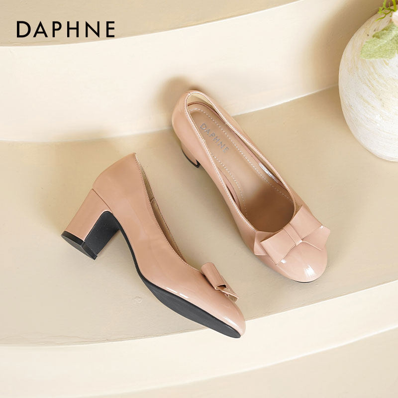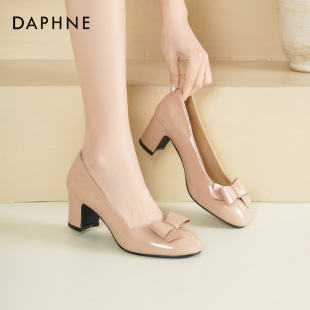 蝴蝶结粗跟不累脚圆头浅口单鞋 达芙妮裸色高跟鞋 新款 2026春季 女鞋