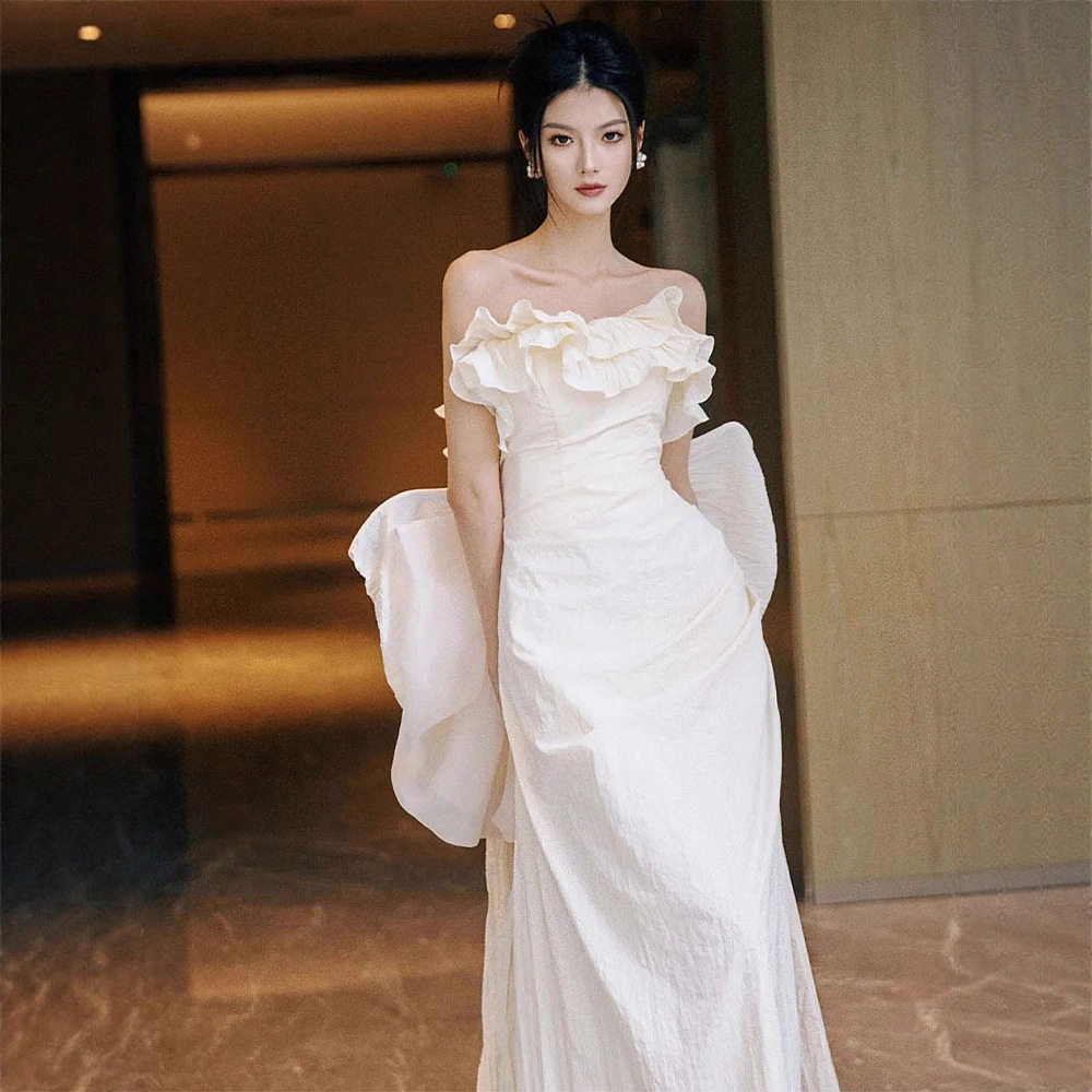 新娘婚礼服出租法式 缎面小个子拖尾一字肩 主纱轻婚纱租赁2025新款