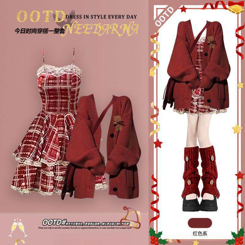 万圣节圣诞穿搭miu系毛衣外套裙子巨好看 红色连衣裙 深秋初冬季