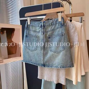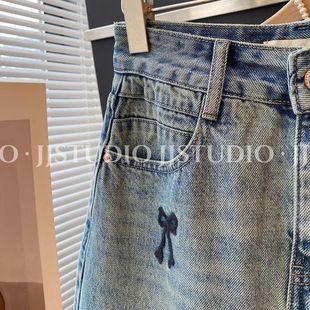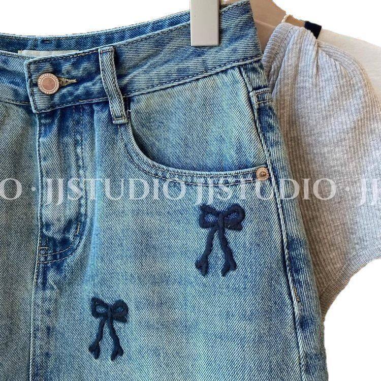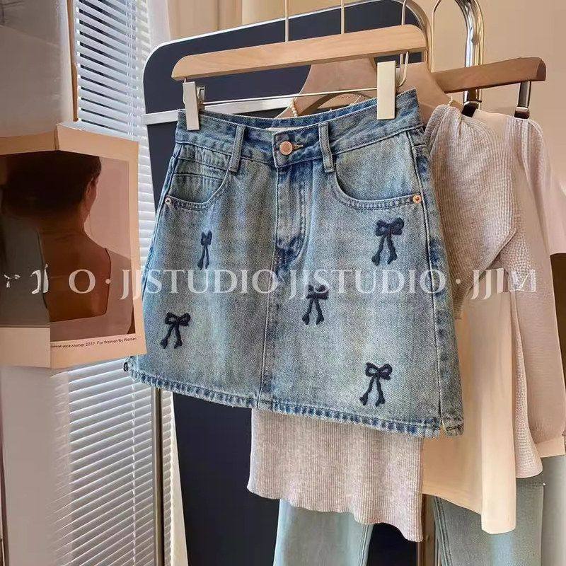 设计感高腰宽松显瘦短裙 新款 韩版 蝴蝶结刺绣牛仔半身裙女2025夏季