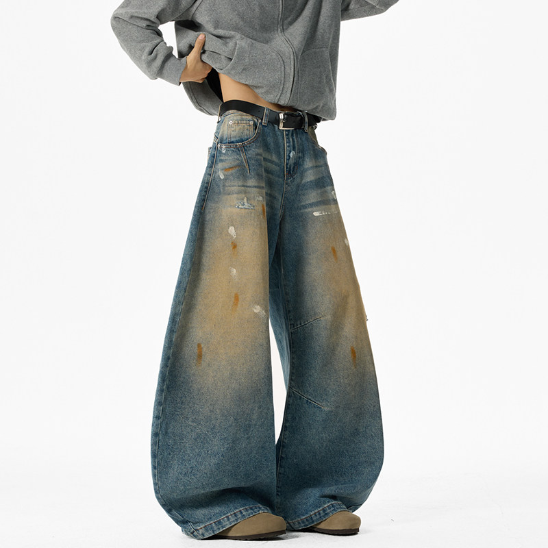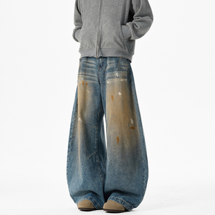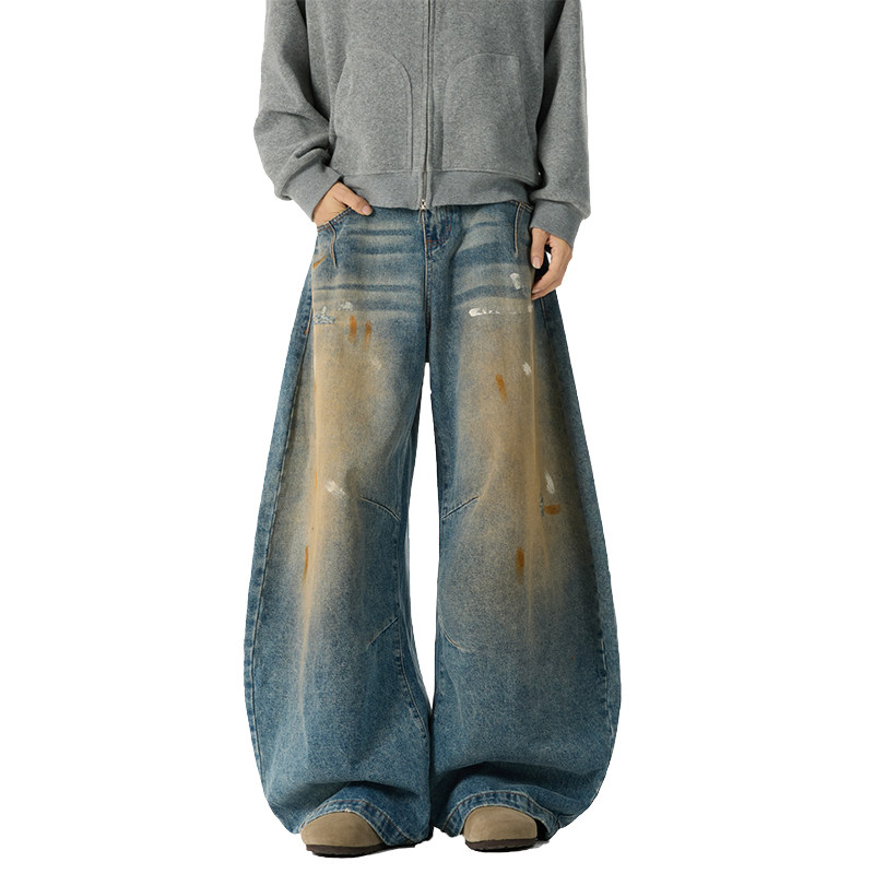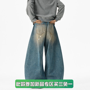 男女水洗街头阔腿痞帅街头长裤 BOYUE帛跃美式 复古做旧弯刀牛仔裤