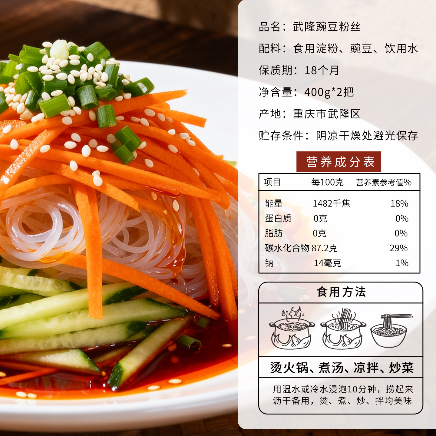 重庆非遗粉丝细粉酸菜鱼花甲米线凉拌炒粉武隆豌豆粉丝400g 2把