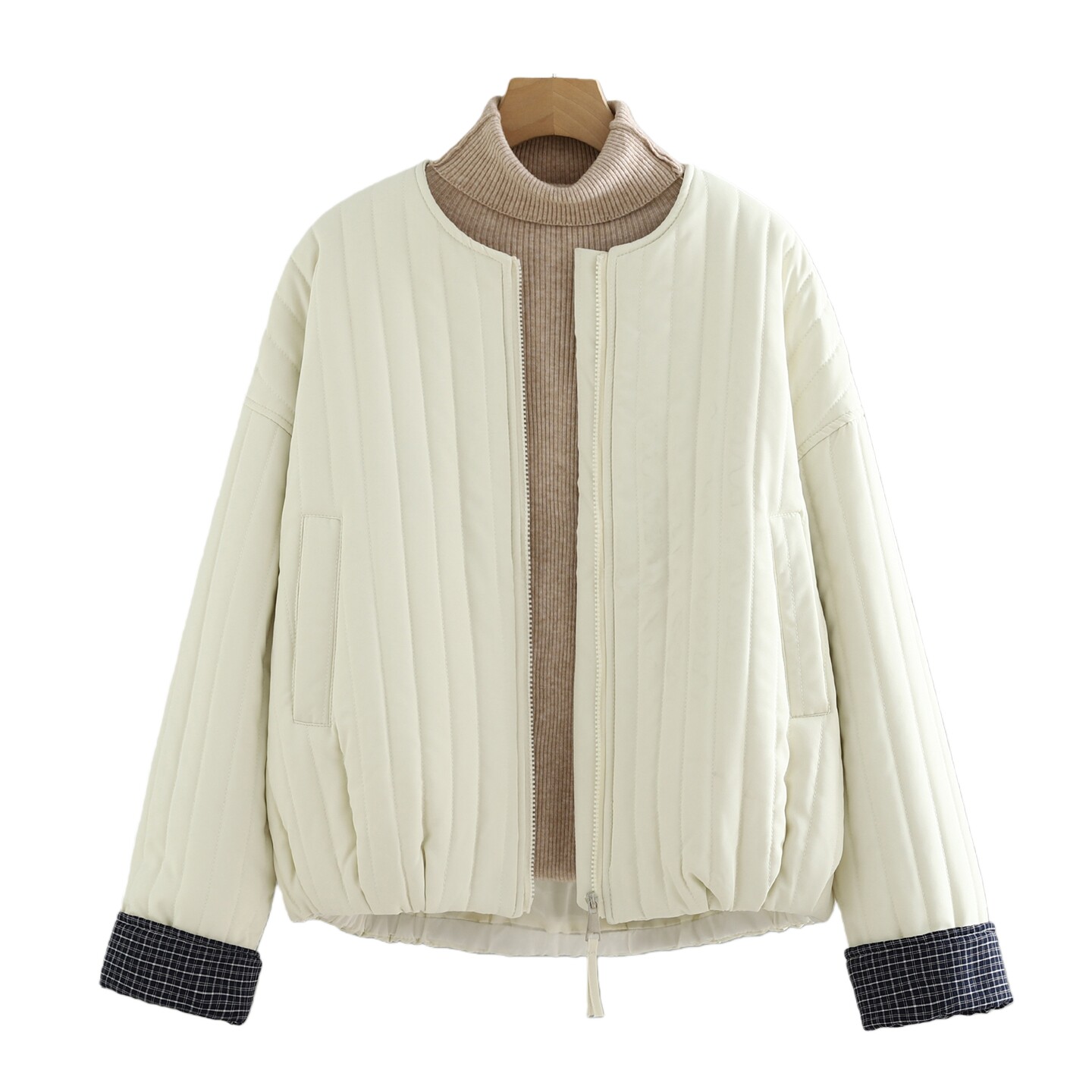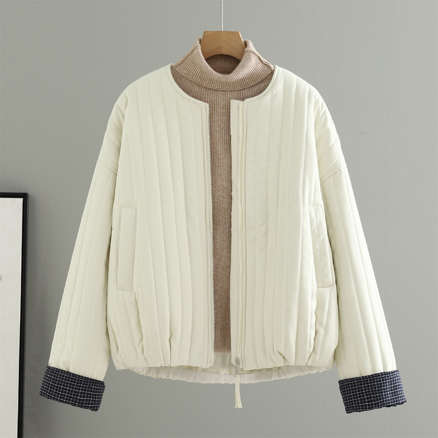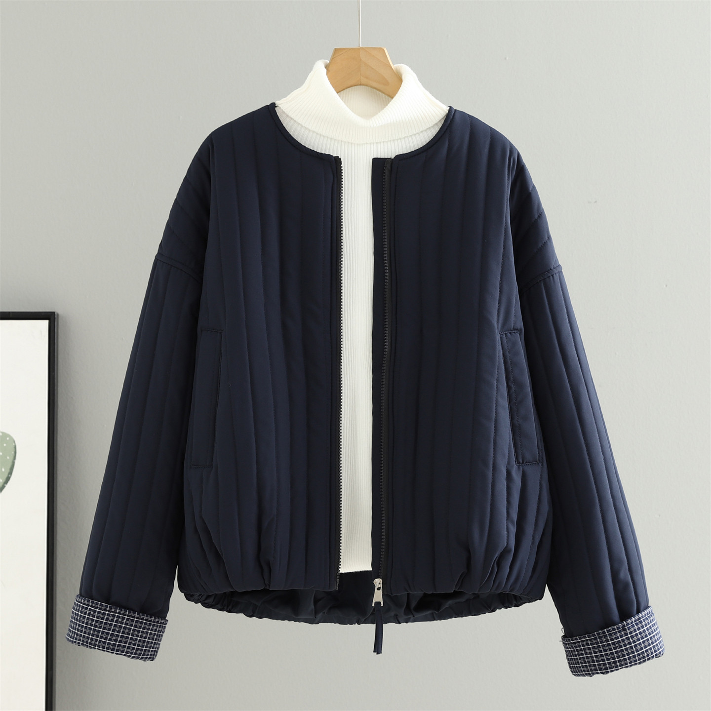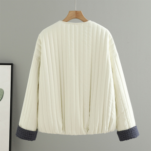 秋冬韩版 宽松显瘦小个子棉服上衣 设计感绗缝竖条纹棉衣外套女短款
