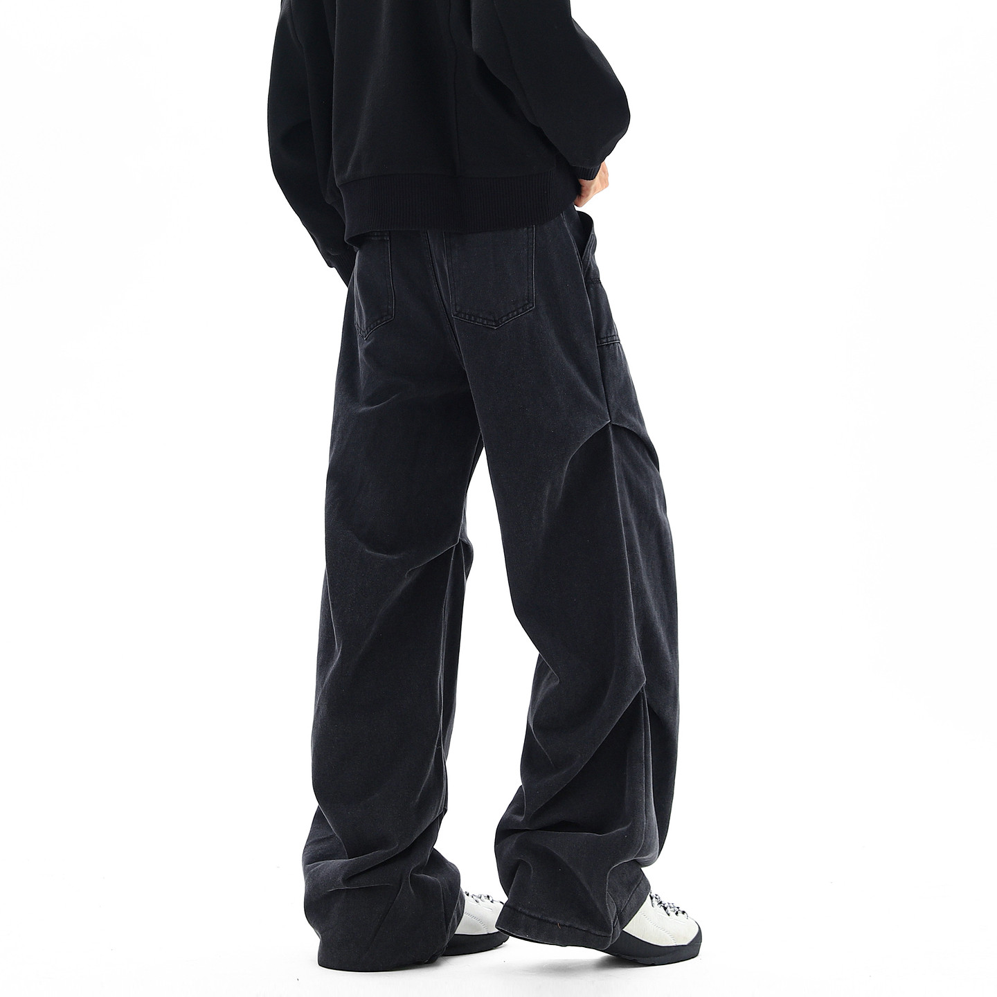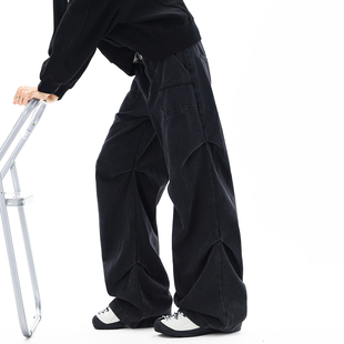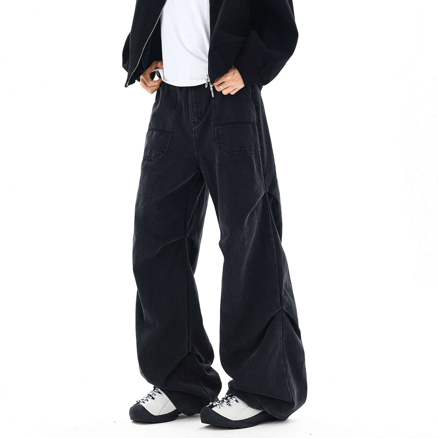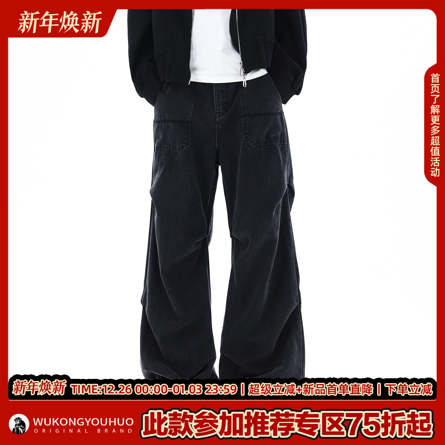 男复古宽松潮流百搭阔腿长裤 牛仔裤 水洗褶皱工装 悟空有货潮牌美式