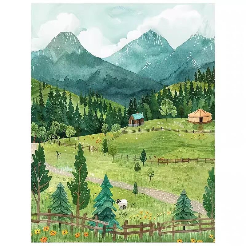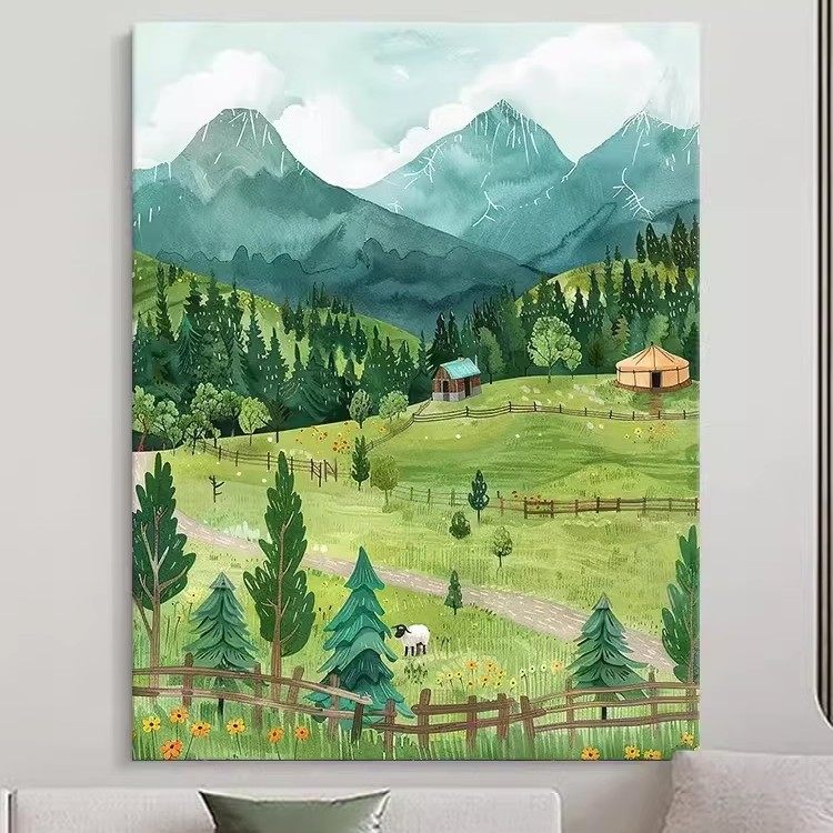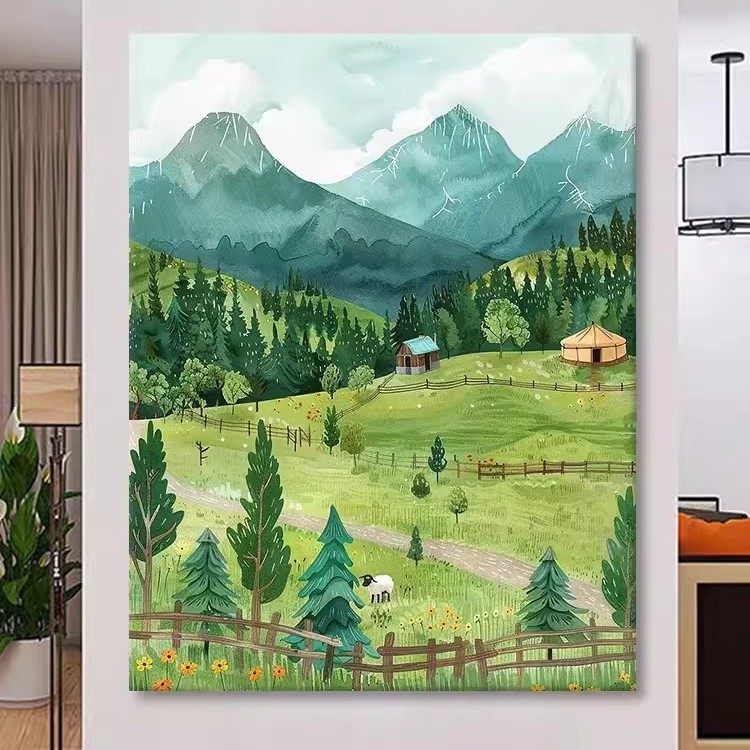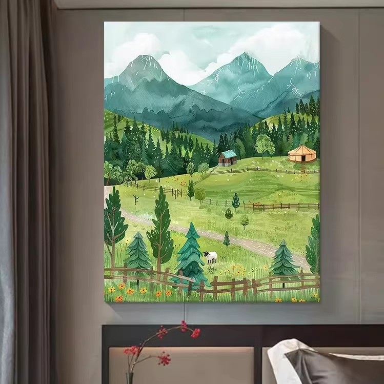 远山草原森林装 饰画绿色仿油画风景绿色唯美高级感卧室客厅摆挂画