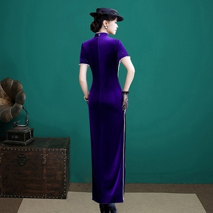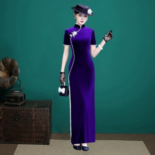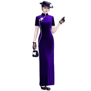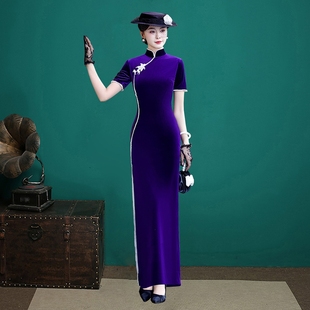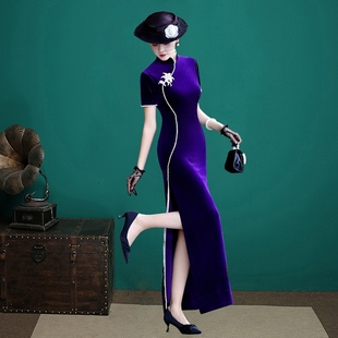 旗袍舞蹈服女古典丝绒黑色珍珠开叉蕾丝民国风改良舞蹈旗袍表演服