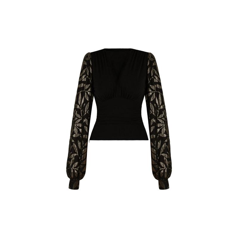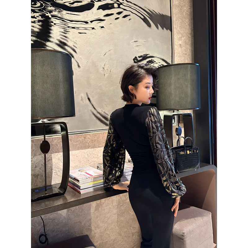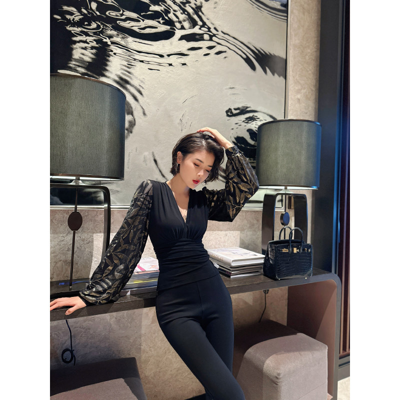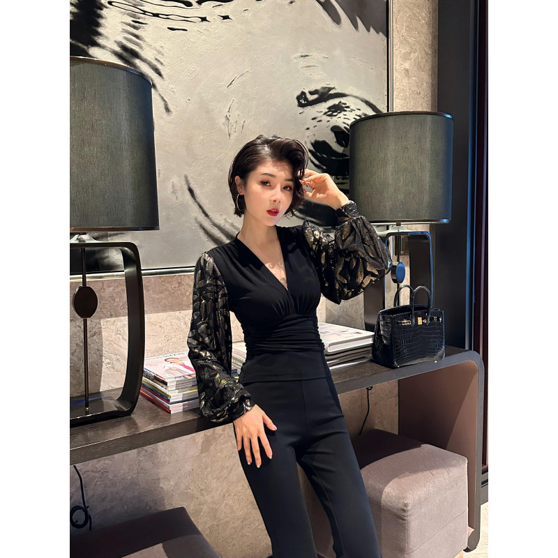 V领上衣 长袖 XULU原创秋冬水晶麻拼接烫金丝绒打底衫 黑色百搭修身