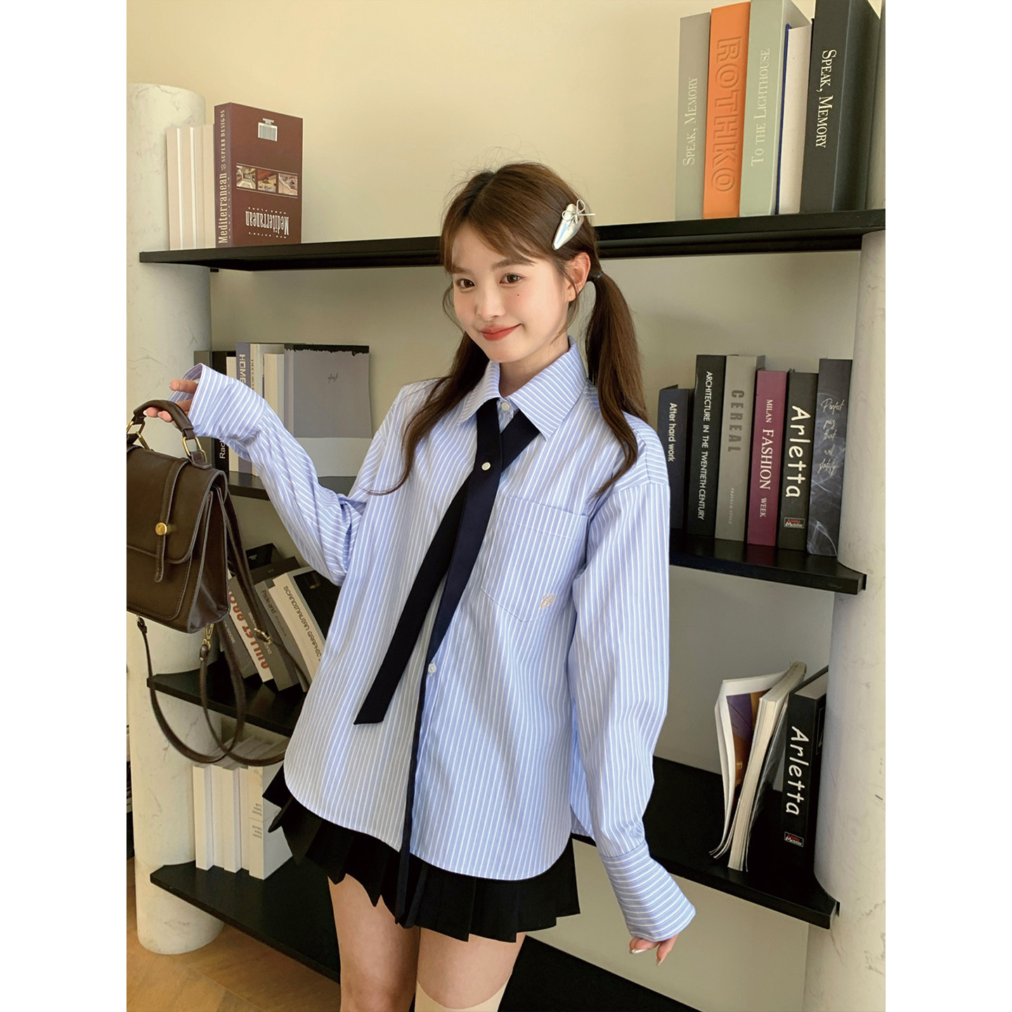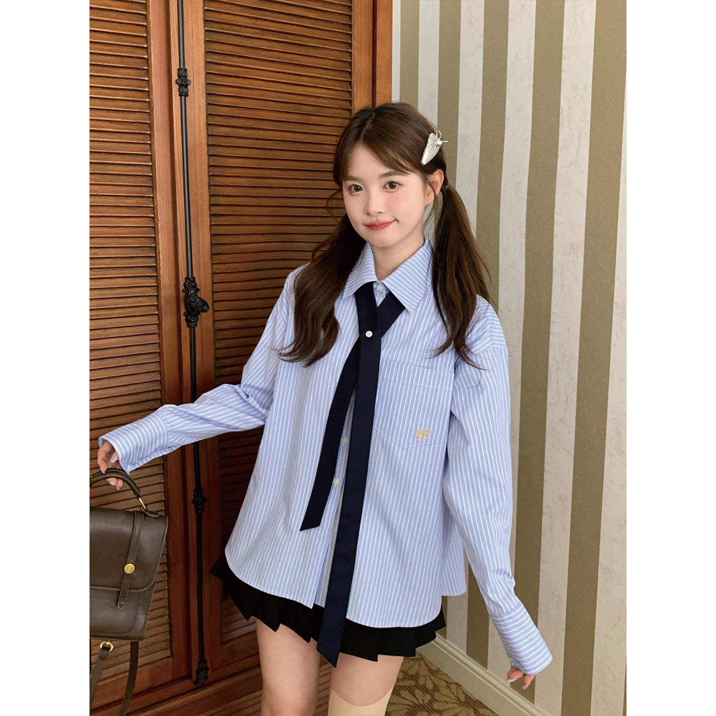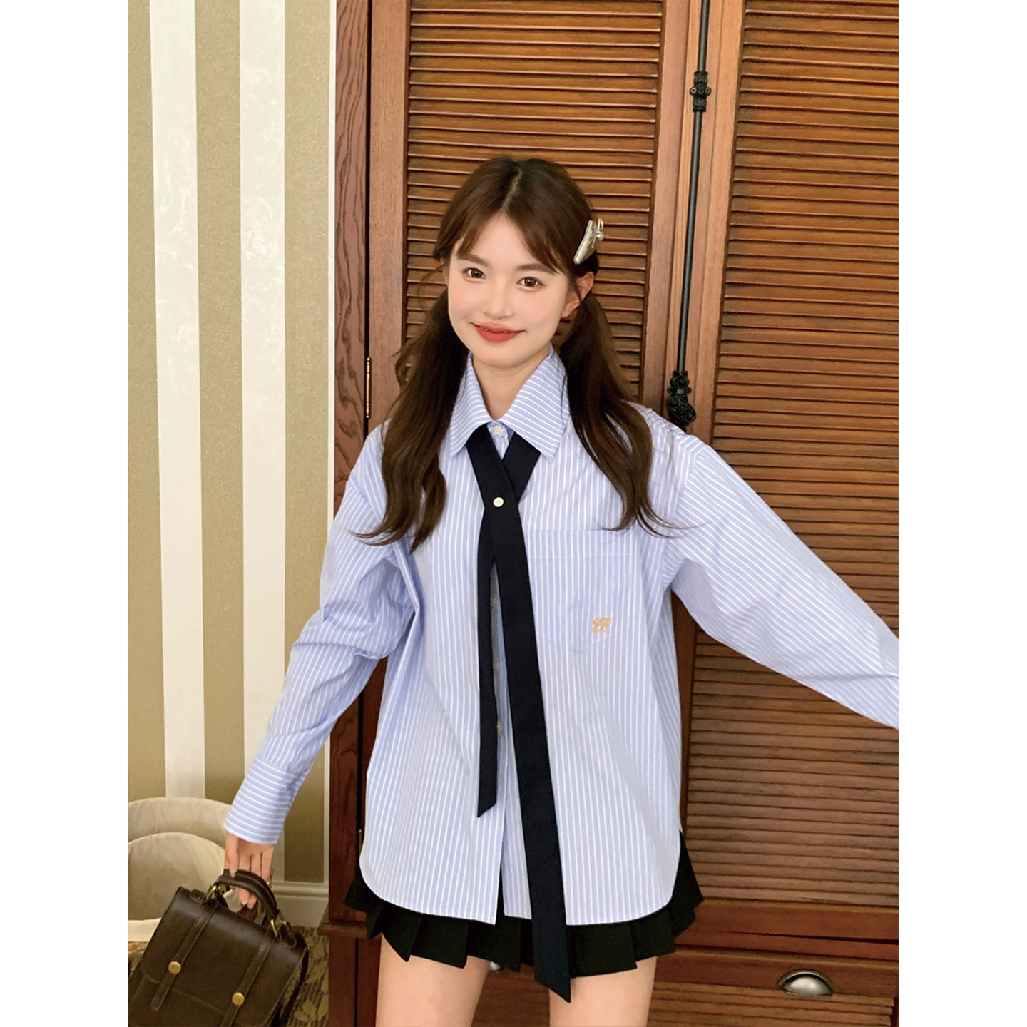 外套学院风交叉领带刺绣衬衣女 蓝色条纹衬衫 东京岁时记jk秋季 新款