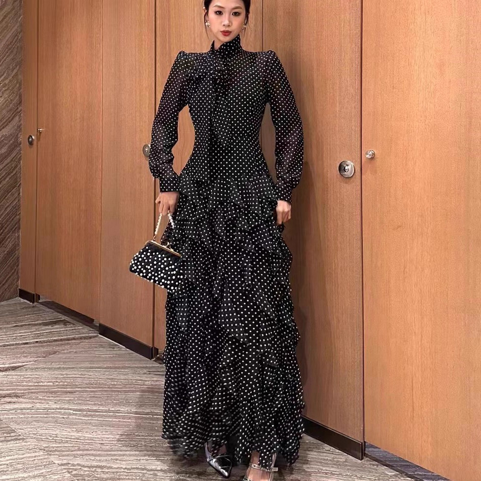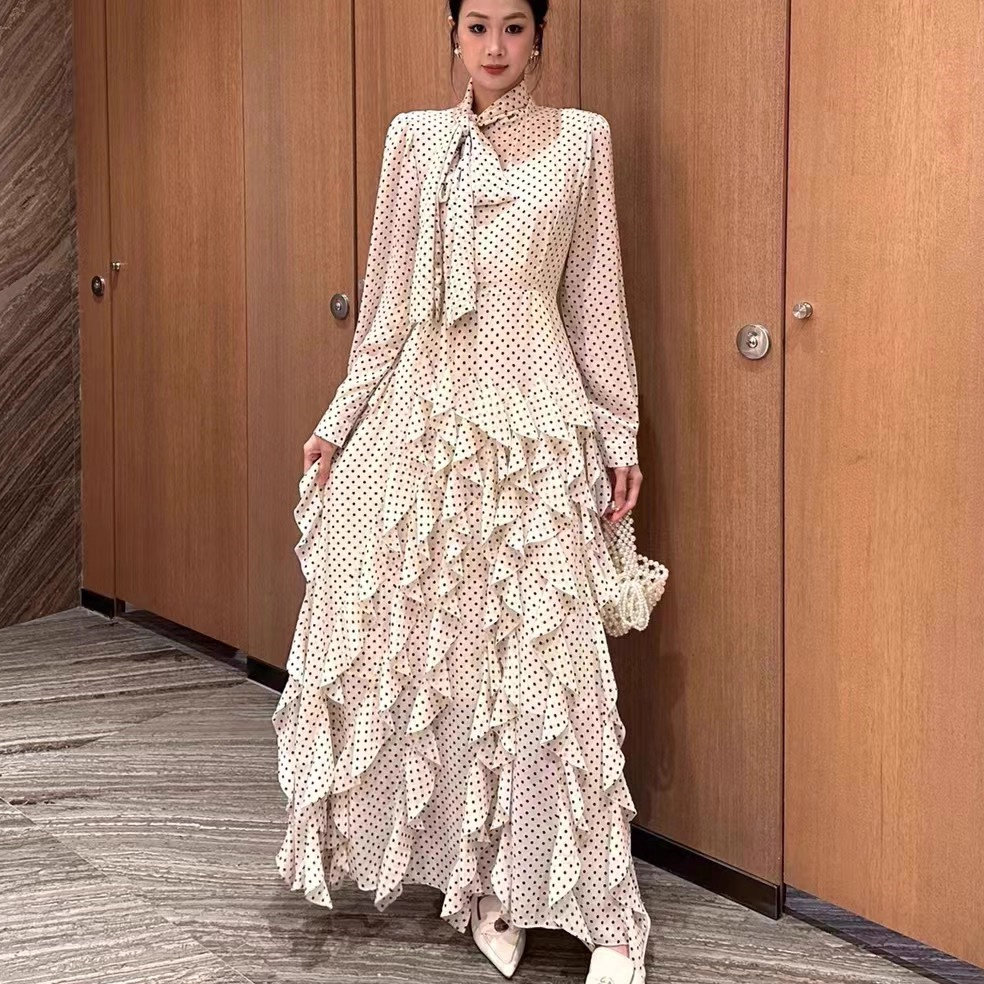 晚装 宴会主持年会礼服2025春秋蝴蝶结飘带波点印花木耳波浪连衣裙
