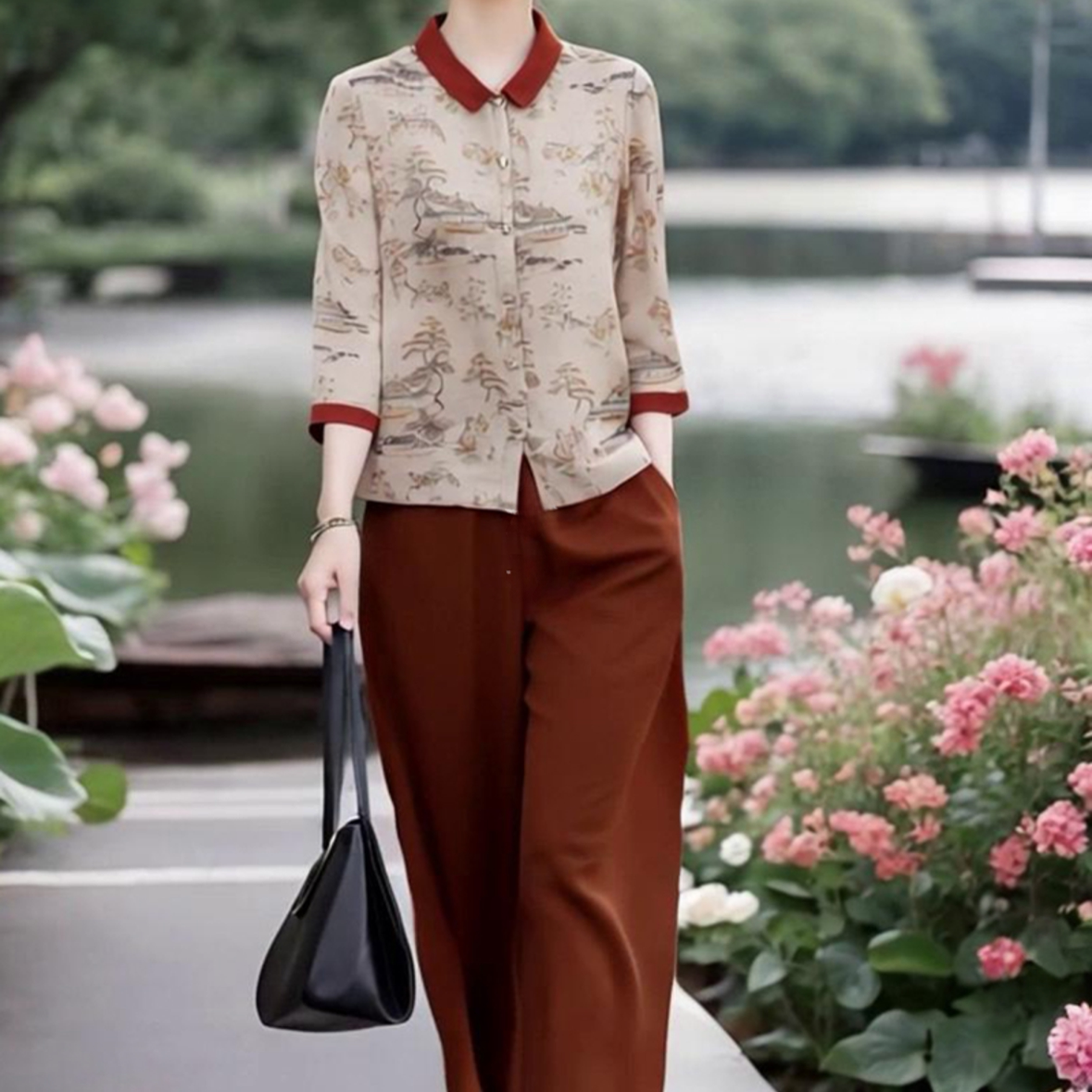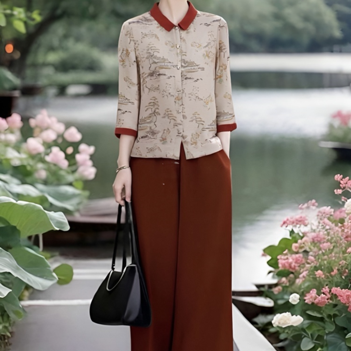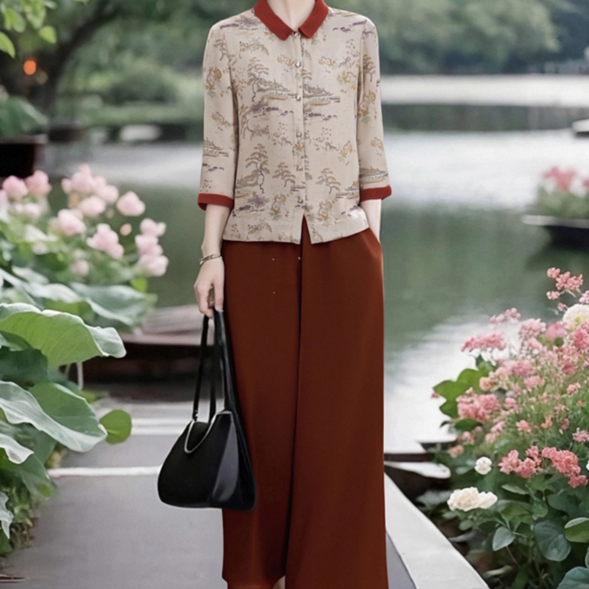 套装 素雅订制女装 松紧腰裤 国风撞色印花衬衫 原创品牌2025早秋新款