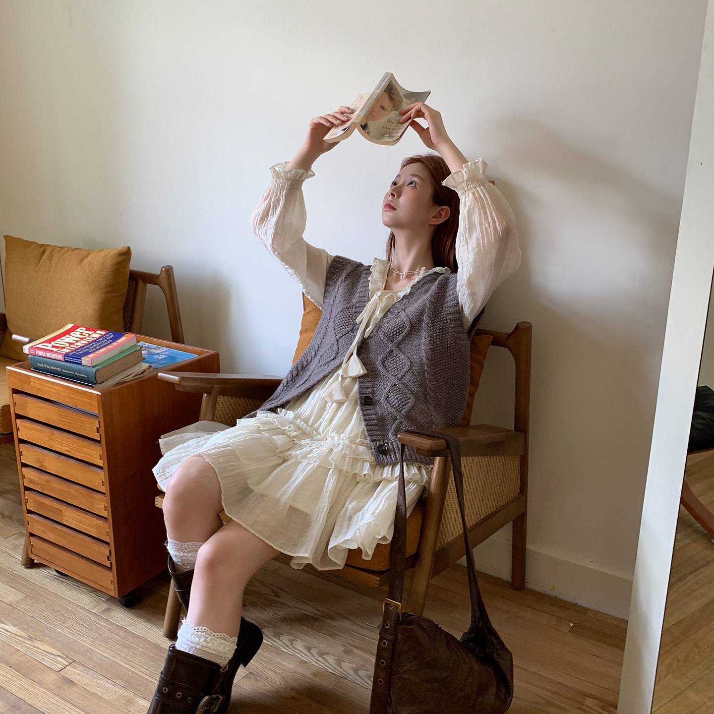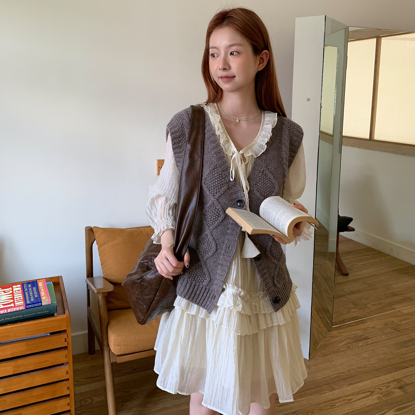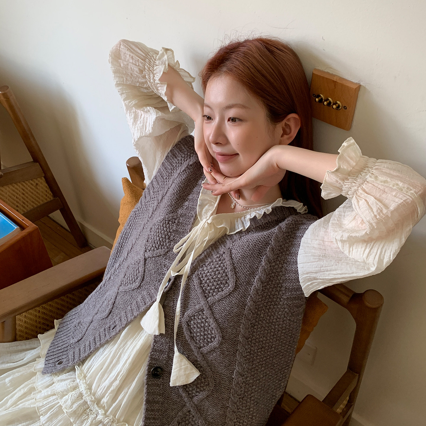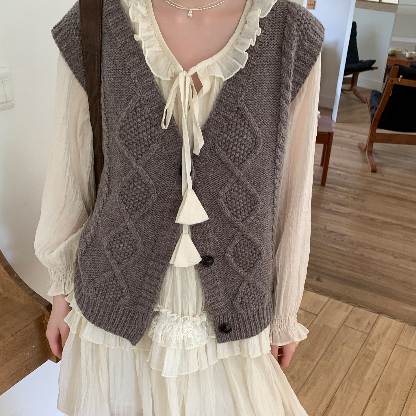 尺尺间Lsland复古v领麻花针织马甲背心女秋冬新款 叠穿百搭开衫