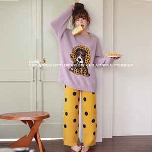 小熊睡衣女秋冬紫色半边绒加绒加厚保暖可爱长袖 可外穿 家居服套装