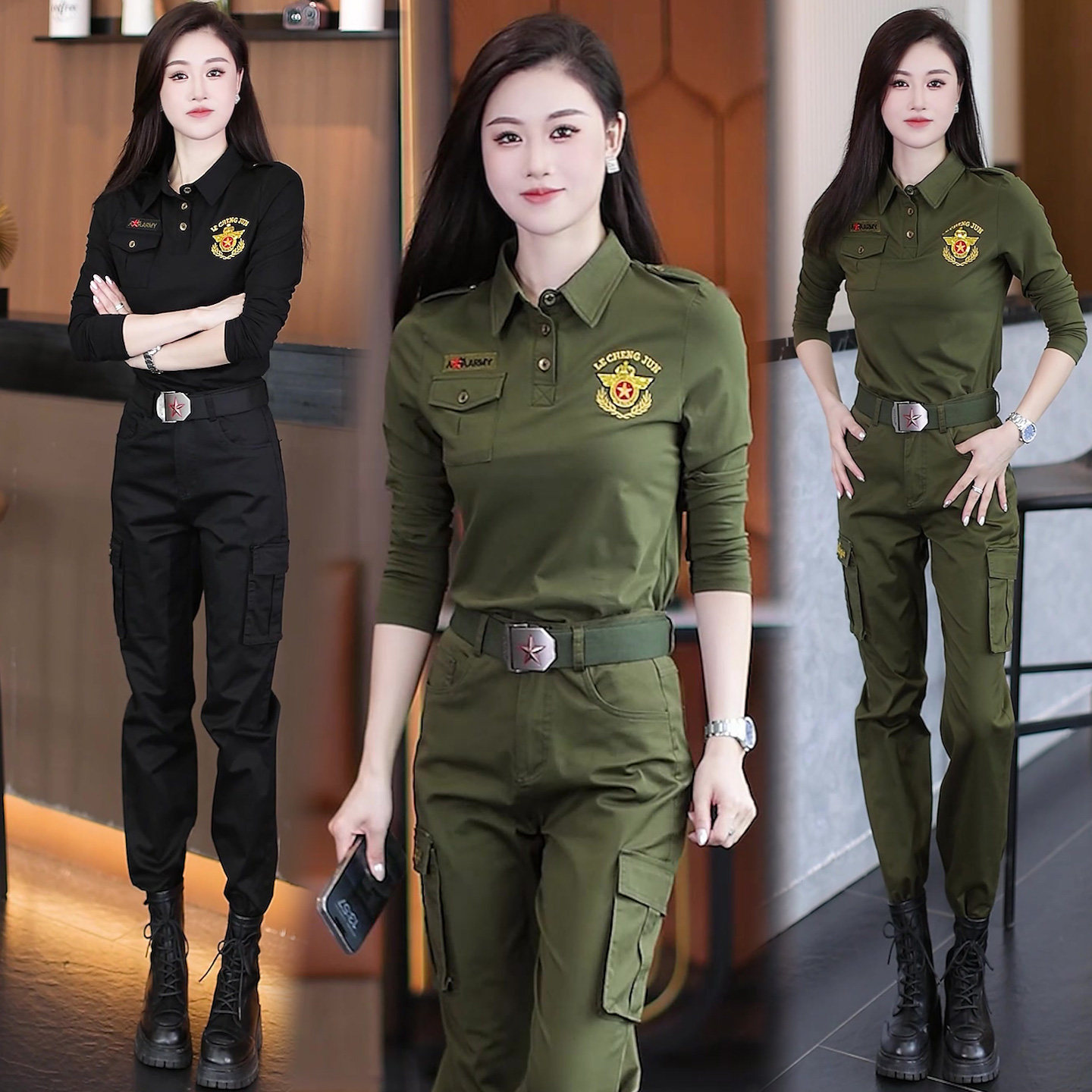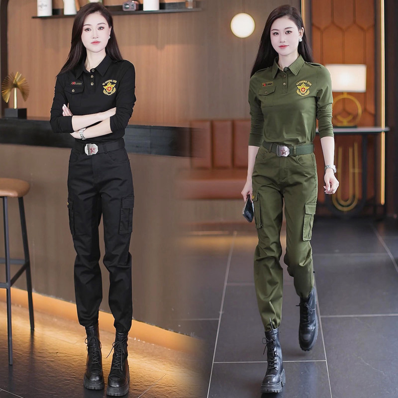 酷飒风长袖 时尚 秋衣显瘦军迷服饰广场舞服 大码 女士军绿迷彩服套装