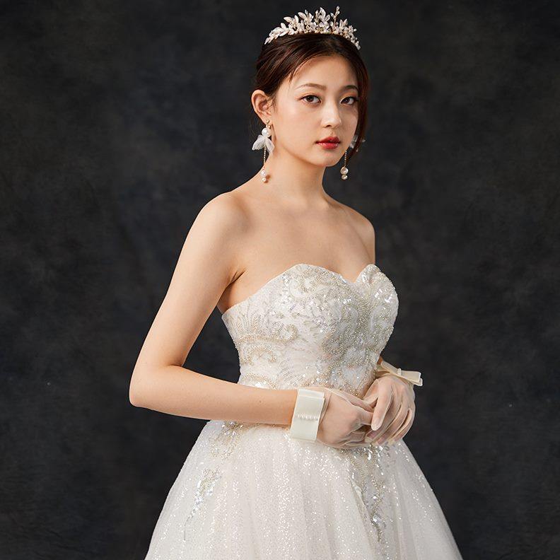 法式 缎面婚纱抹胸显瘦极简风公主蓬蓬裙齐地新娘结婚出门纱旅拍仙