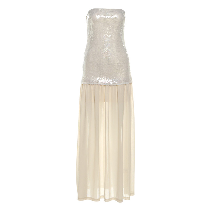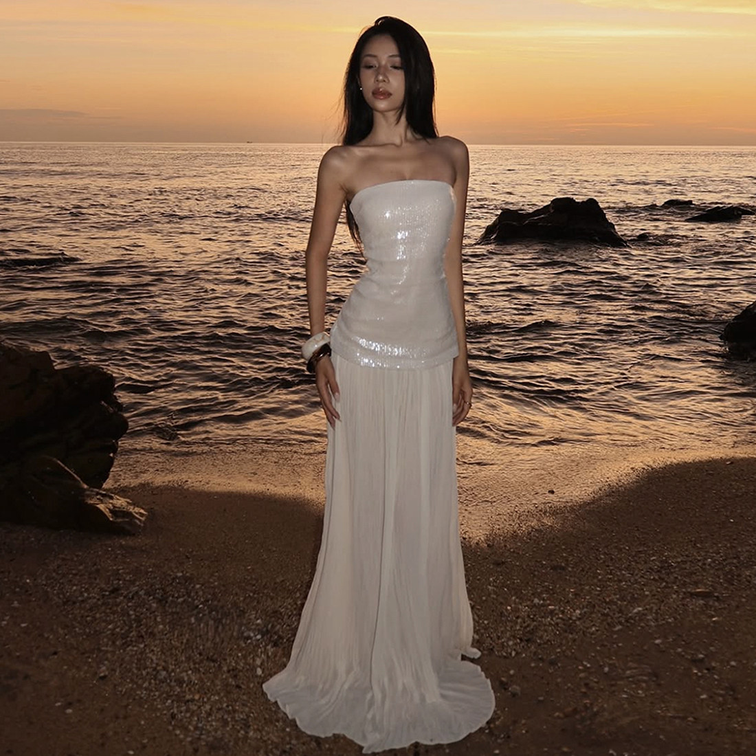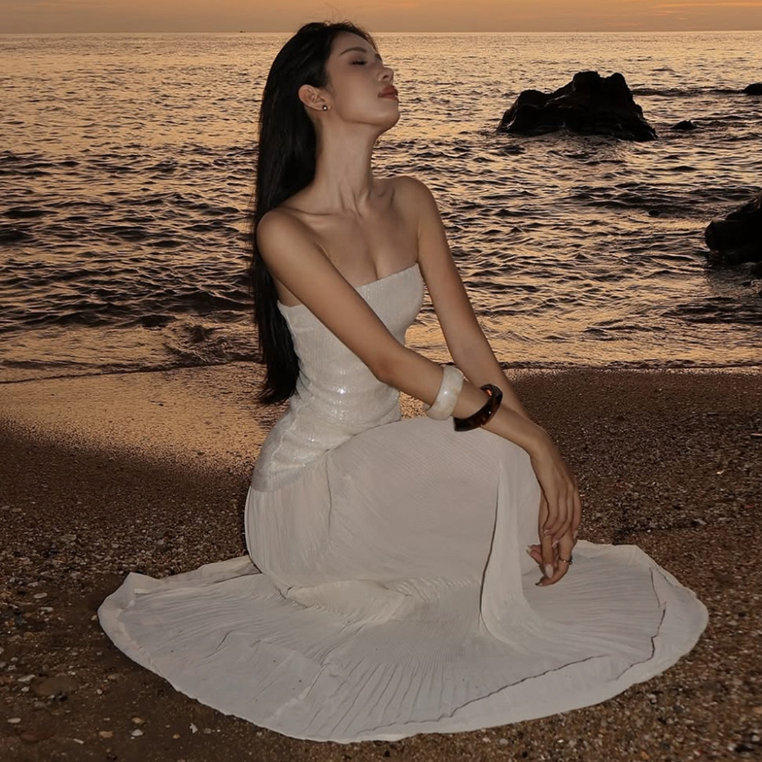 怪诞女孩 拼接网纱长裙鱼尾裙 海边度假绝美细闪亮片抹胸连衣裙女
