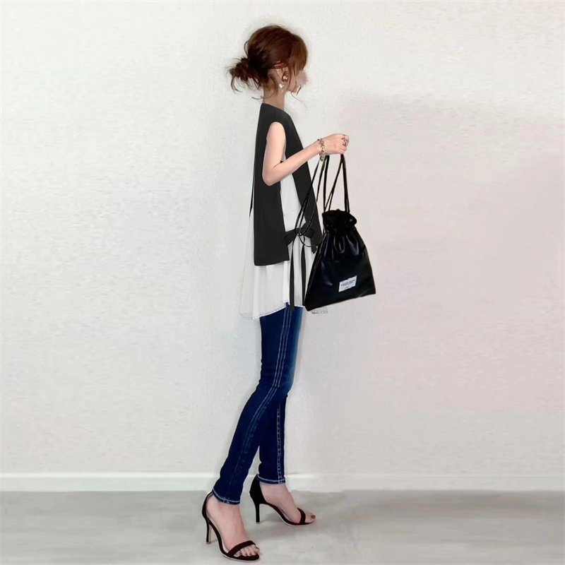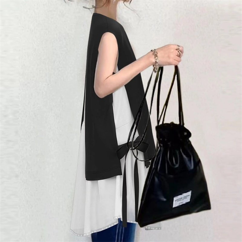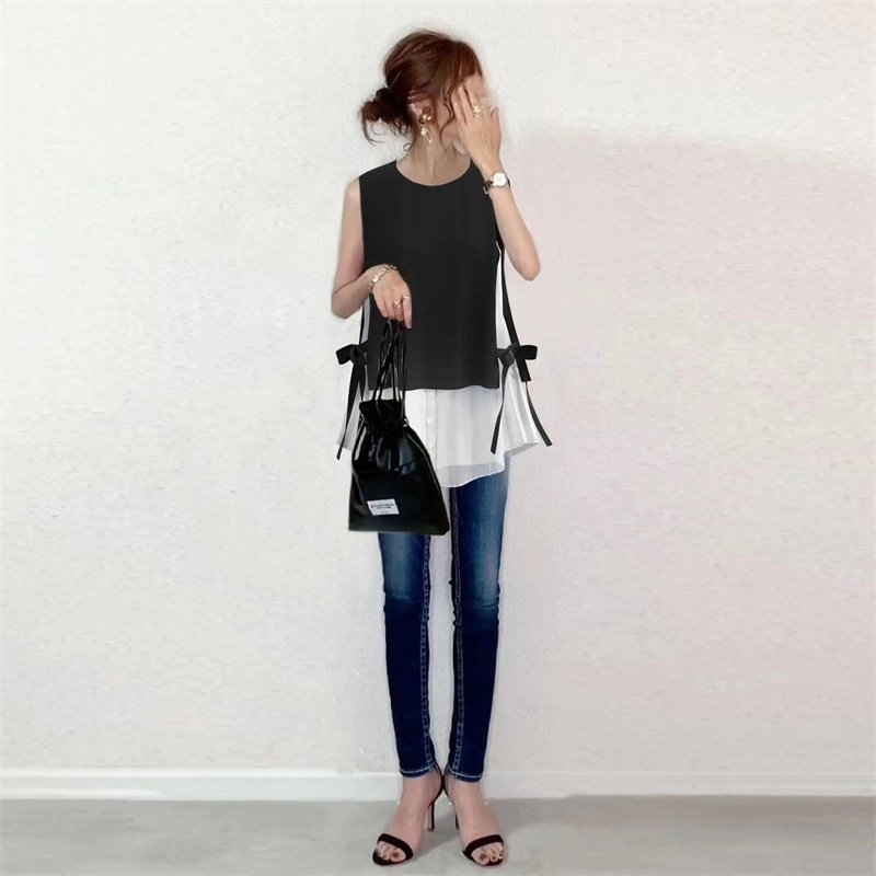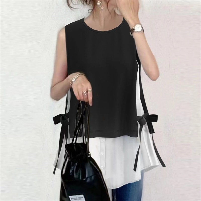 two 衬衣Fake pieces 无袖 亚马逊侧边开叉绑带拼接撞色假两件衬衫
