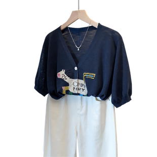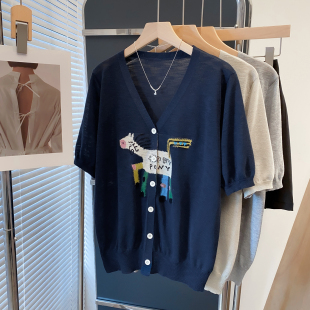 新款 女2026夏装 宽松慵懒风上衣薄款 短袖 潮 开衫 t恤衫 v领提花针织衫