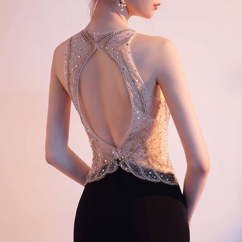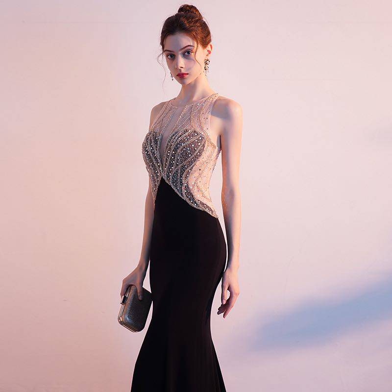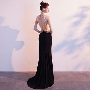 黑色挂脖晚礼服女2020新款 宴会主持人露肩气质鱼尾包Z臀连衣裙女