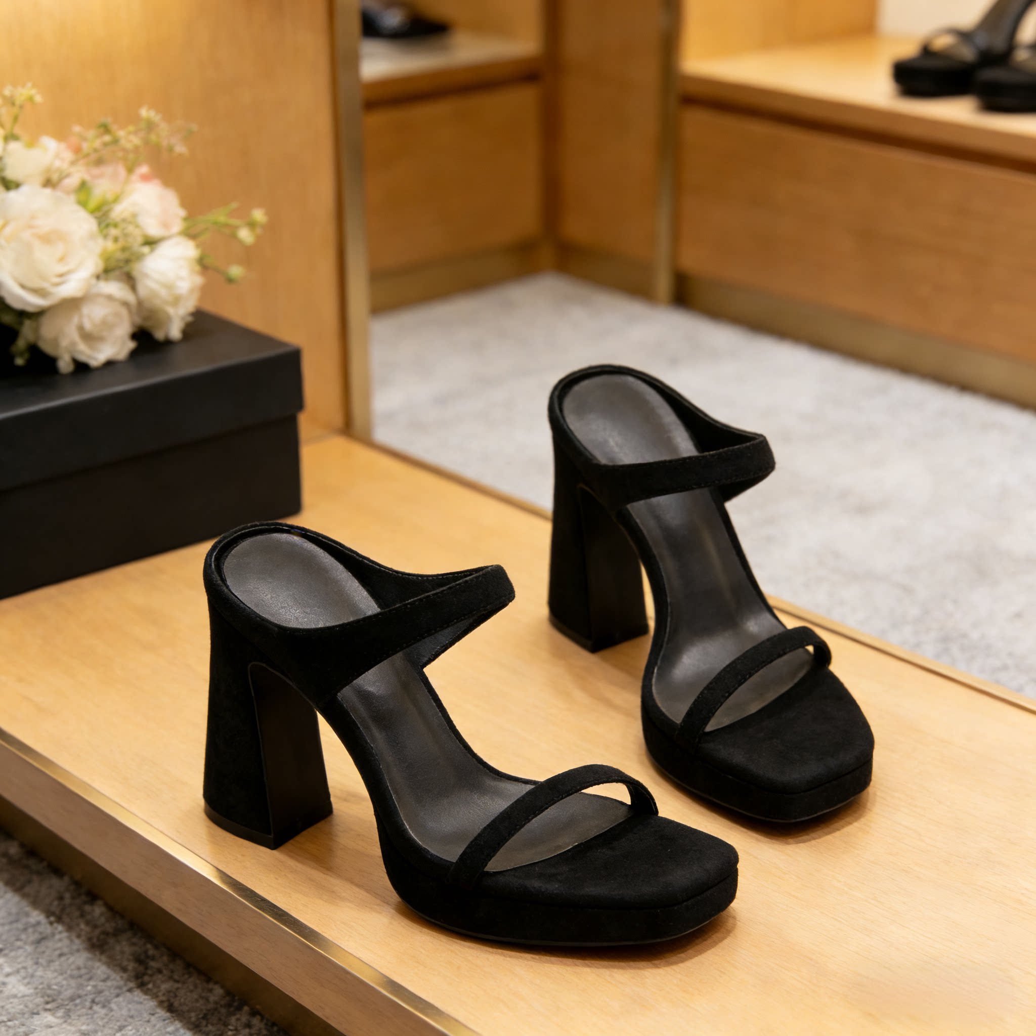 黑色粗跟凉拖鞋 百搭高级感 女夏外穿10cm防水台方头一字带高跟凉鞋