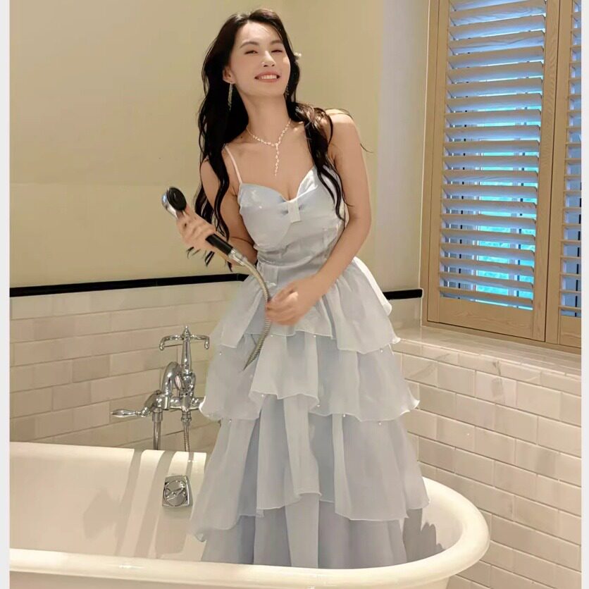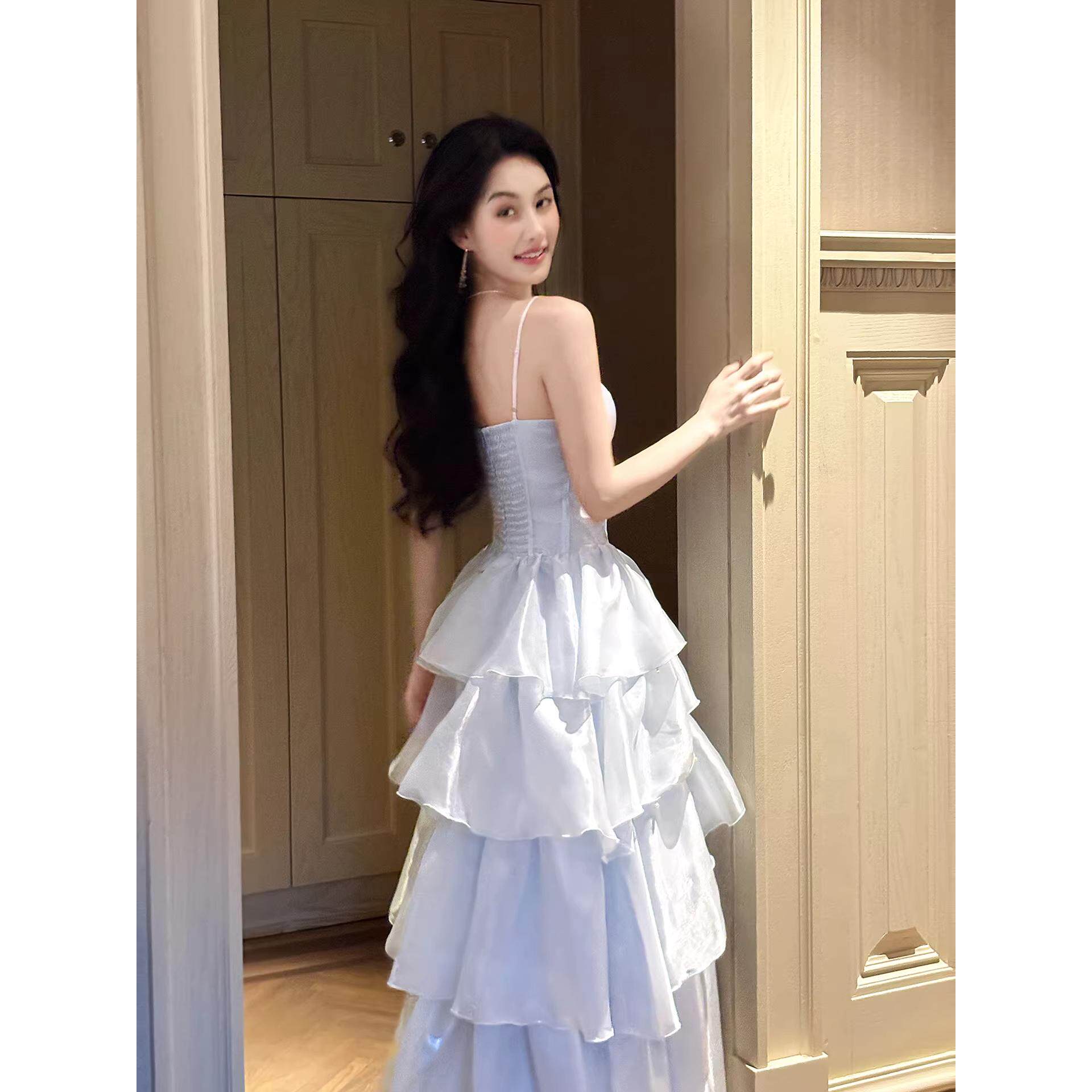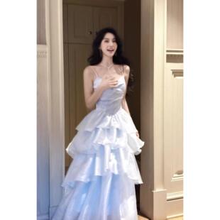 法式 连衣裙生日礼服蝴蝶结设计小众优雅多层次裙 小资蓝色吊带修身