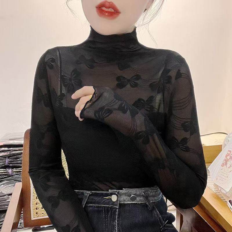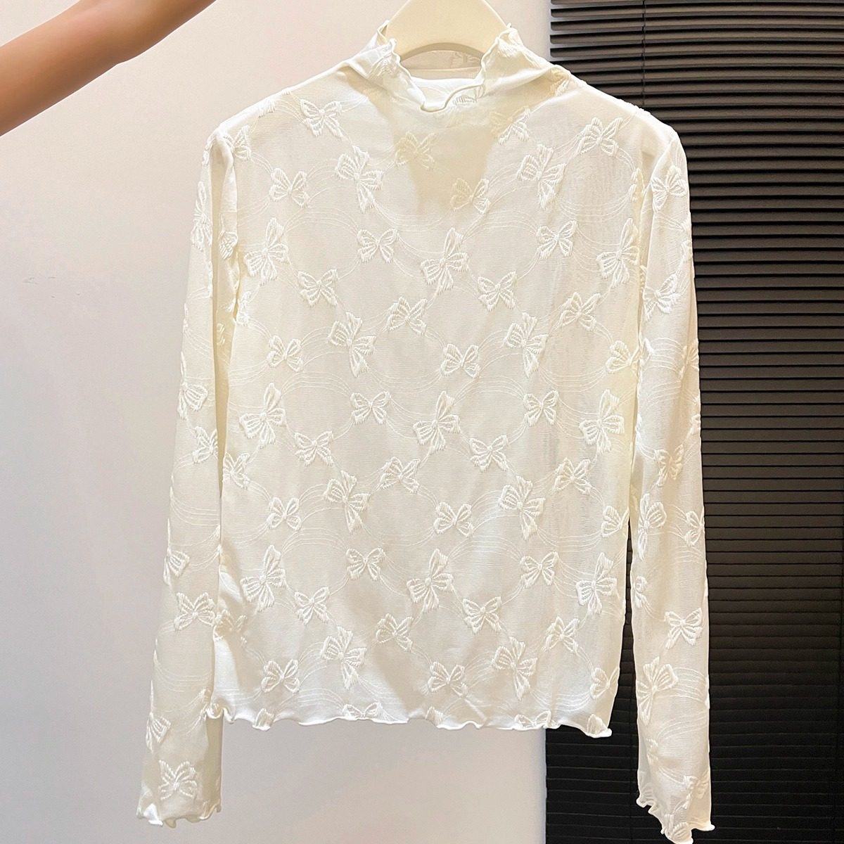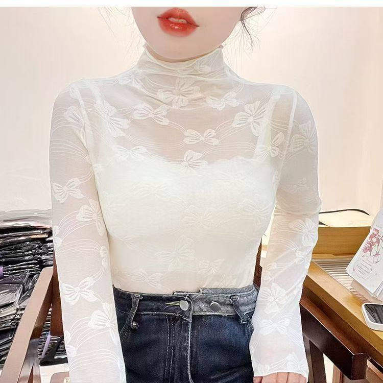 春季 女秋冬叠穿毛衣内搭网纱提花高级感上衣洋气 木耳领蕾丝打底衫