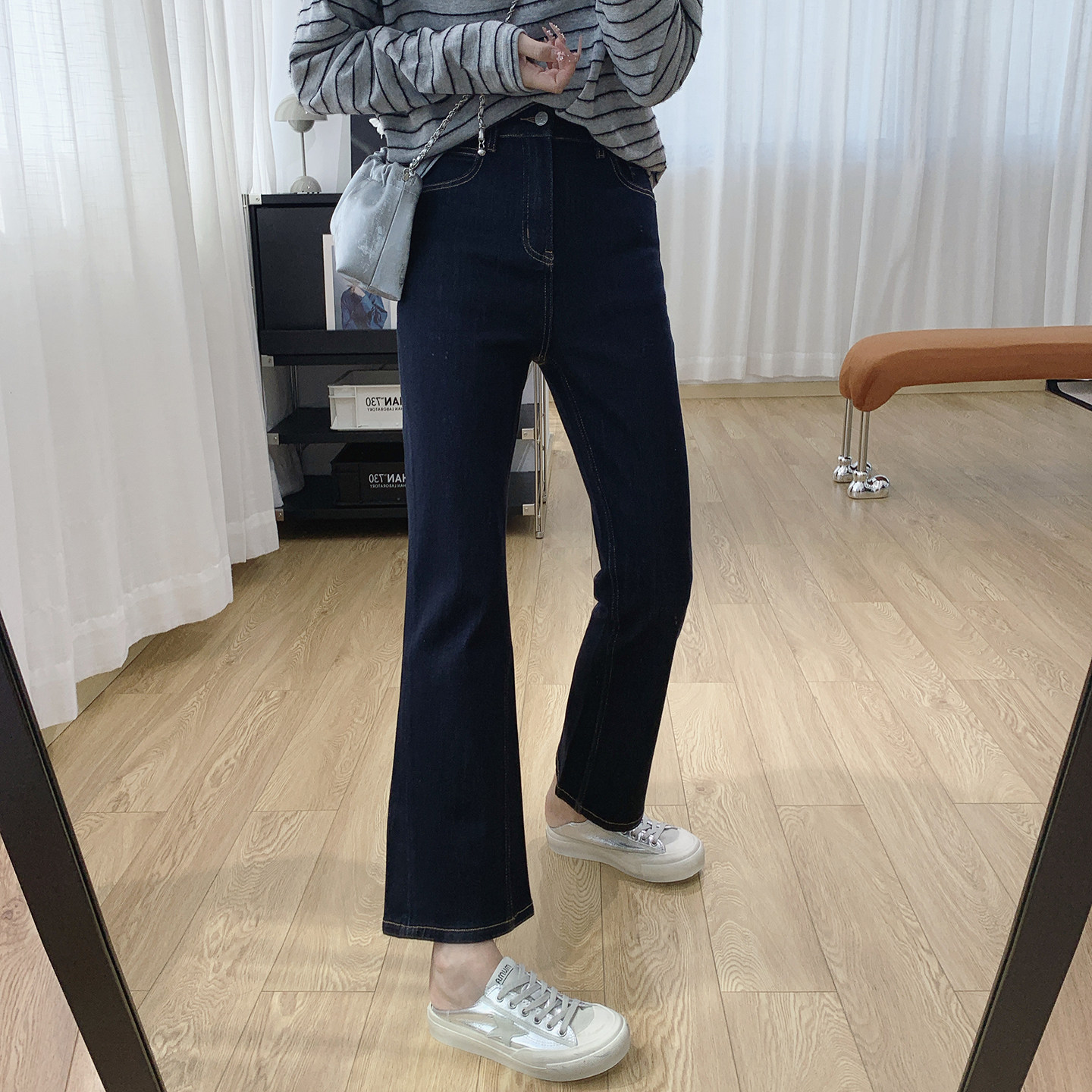 子 高腰显瘦复古垂感喇叭裤 黑灰色双排扣微喇牛仔裤 女秋冬加绒新款
