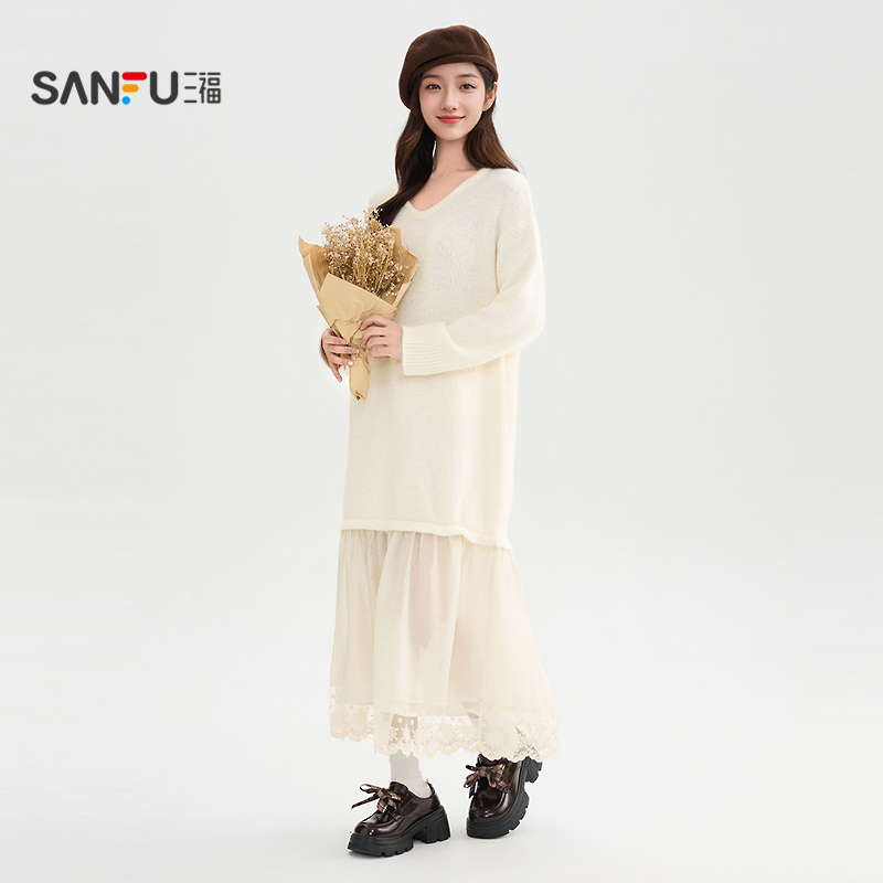 509071 气质V领蕾丝花边拼接毛衣长裙女装 三福连衣裙2025新款 冬季