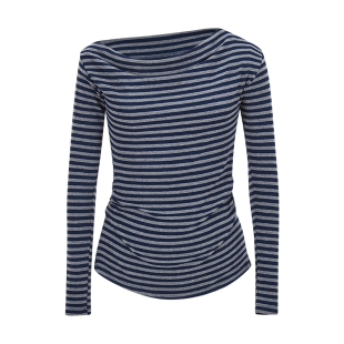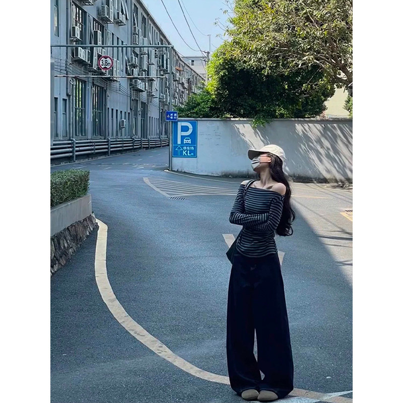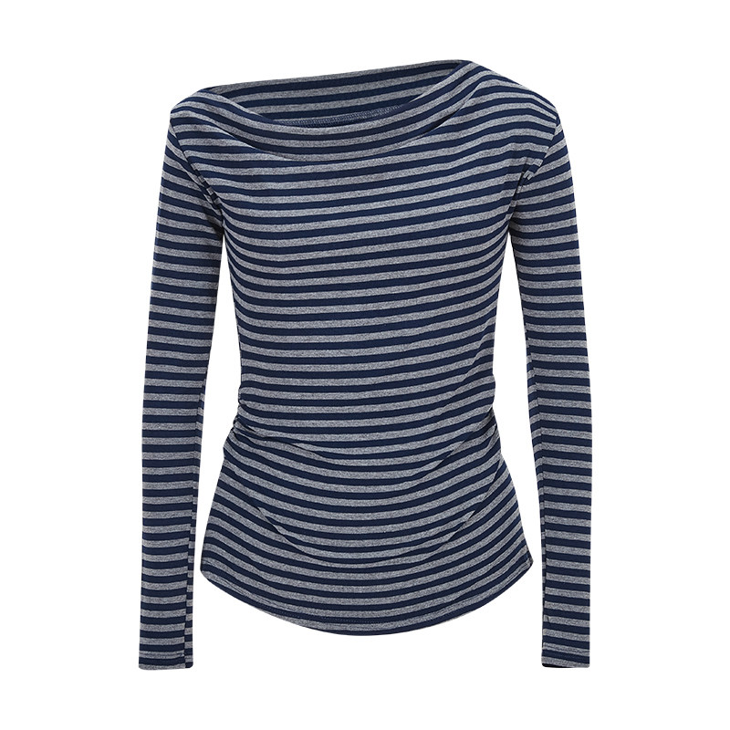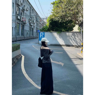 MosesQueen魔西女王一字肩条纹长袖 斜肩上衣 t恤女春秋内搭打底衫