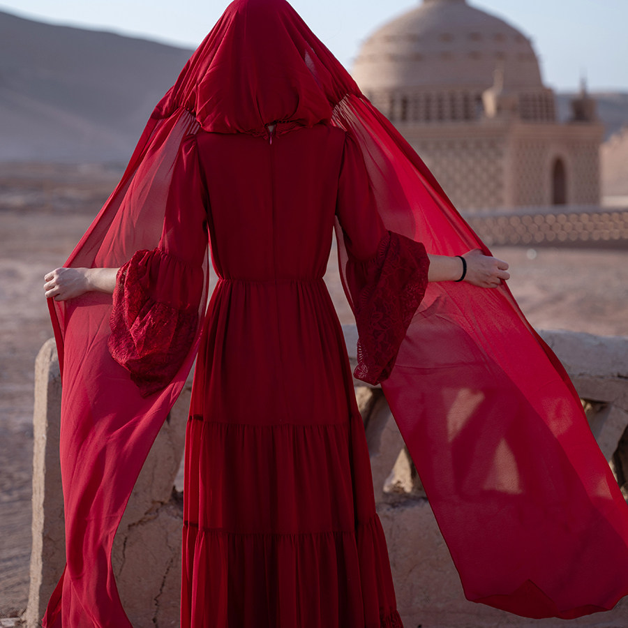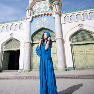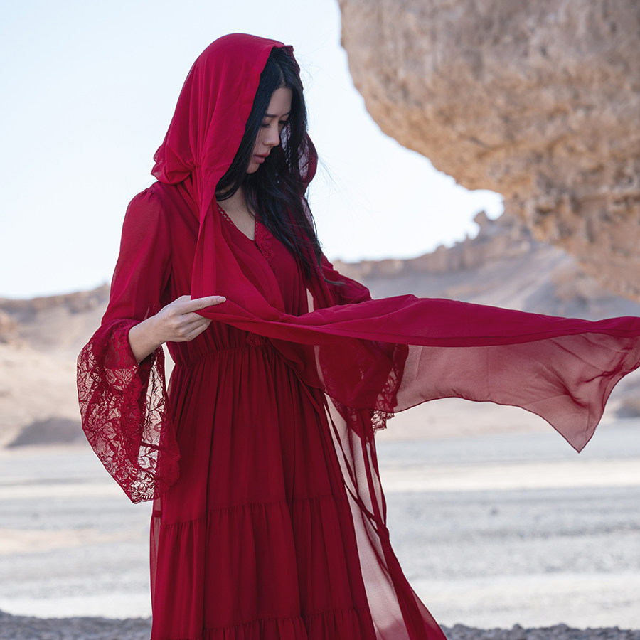 理想三旬女装 连衣裙长裙 复古波西米亚民族风蕾丝拼接大裙摆喇叭袖