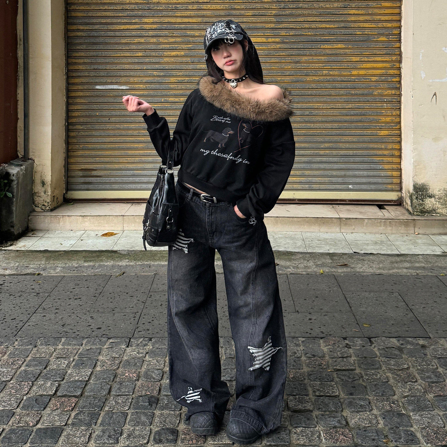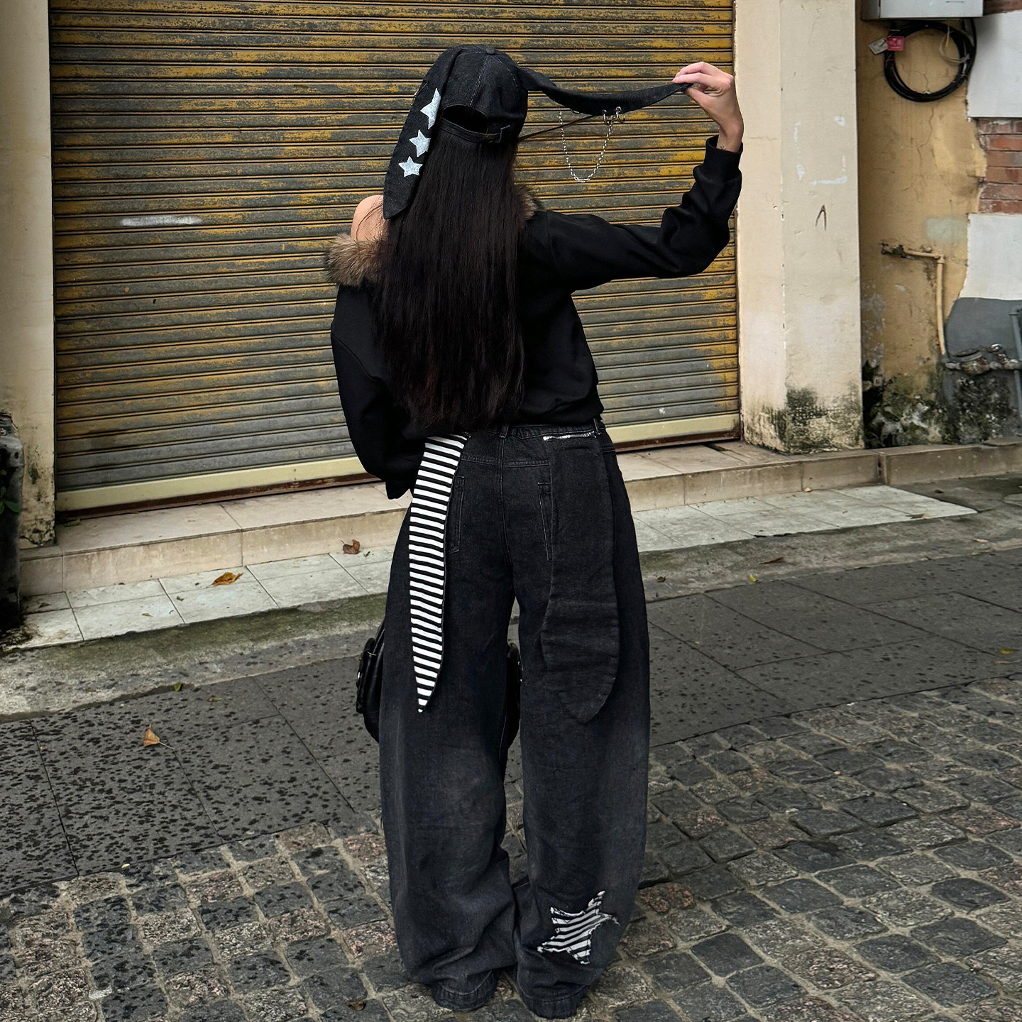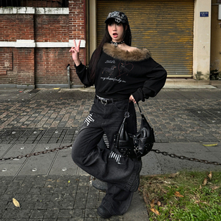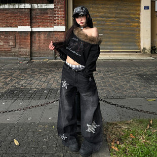女胖mm星星贴布设计辣妹风阔腿裤 黑色高腰显瘦牛仔裤 子 女装 特大码