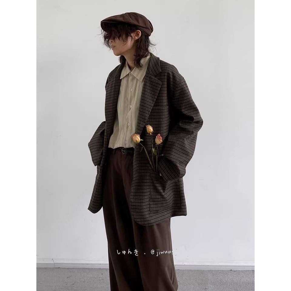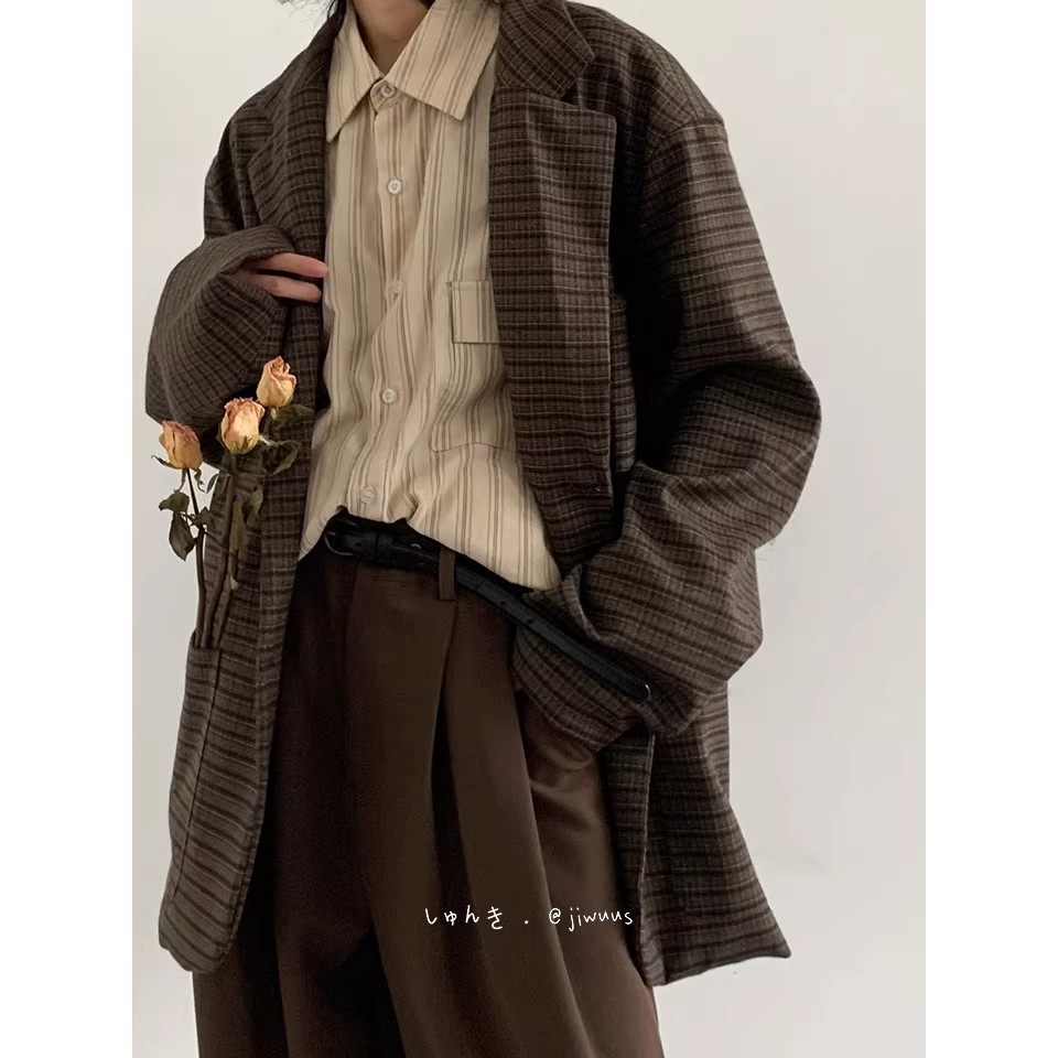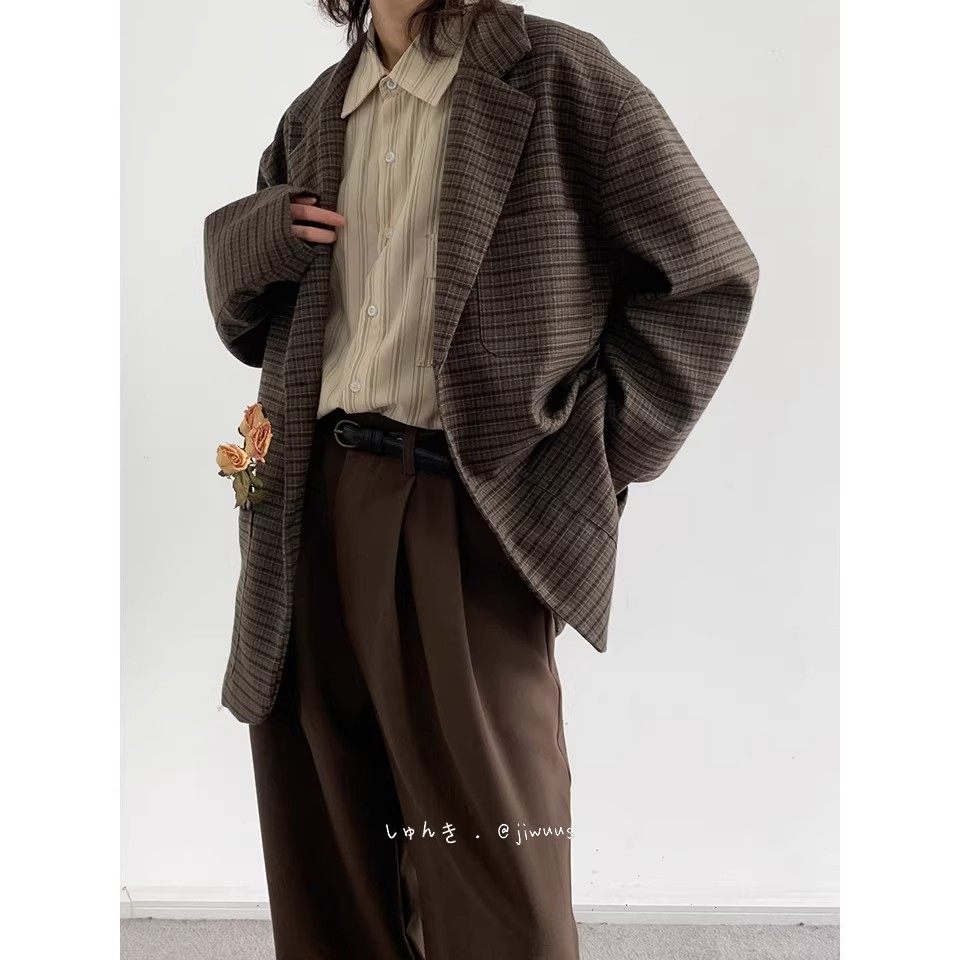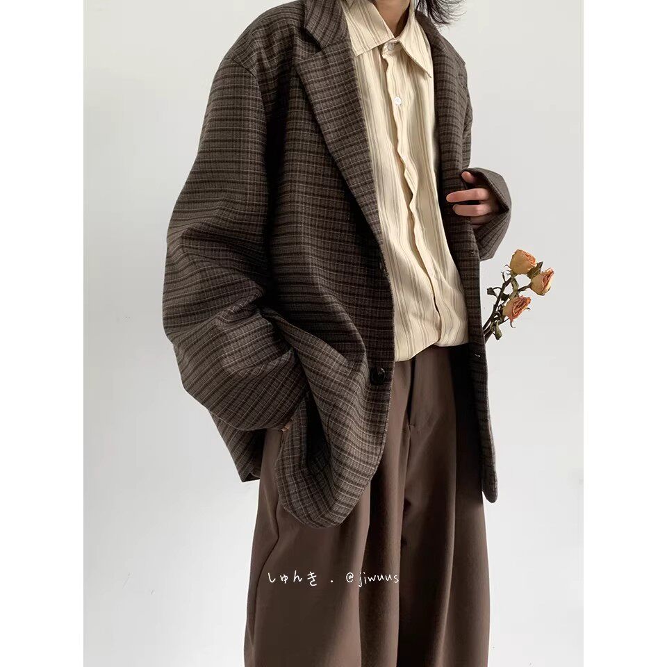 日系复古细格纹西服男宽松小众设计休闲格子外套小西装 搭配 一套装