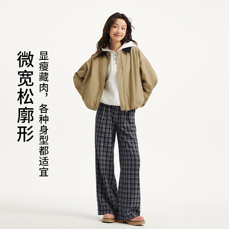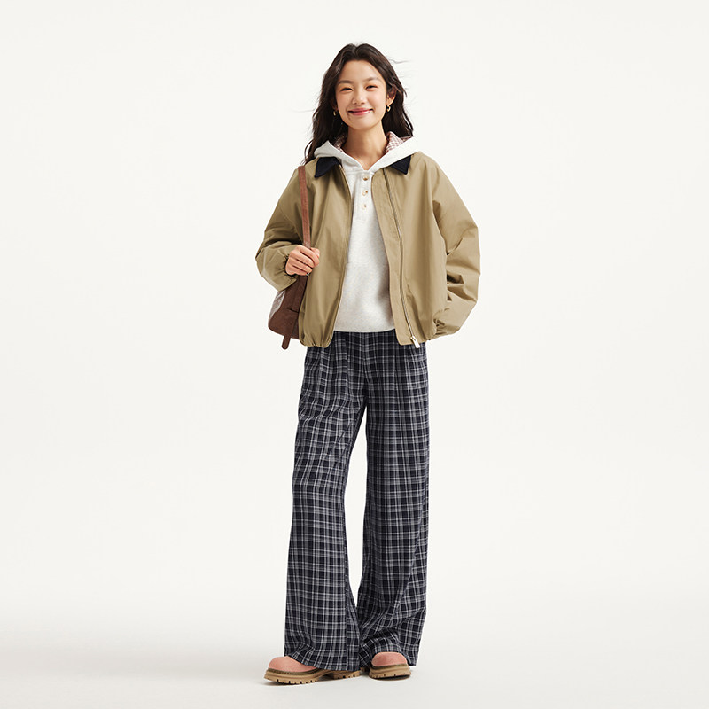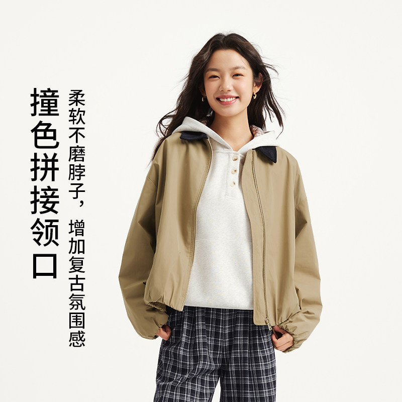 热风女士夹克外套老钱风上衣2026年春季 撞色领飞行夹克外套 新款