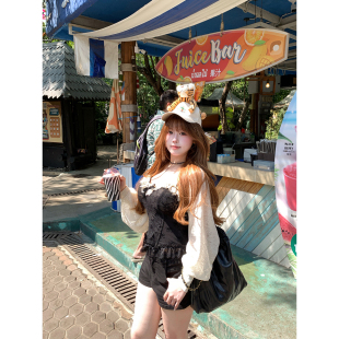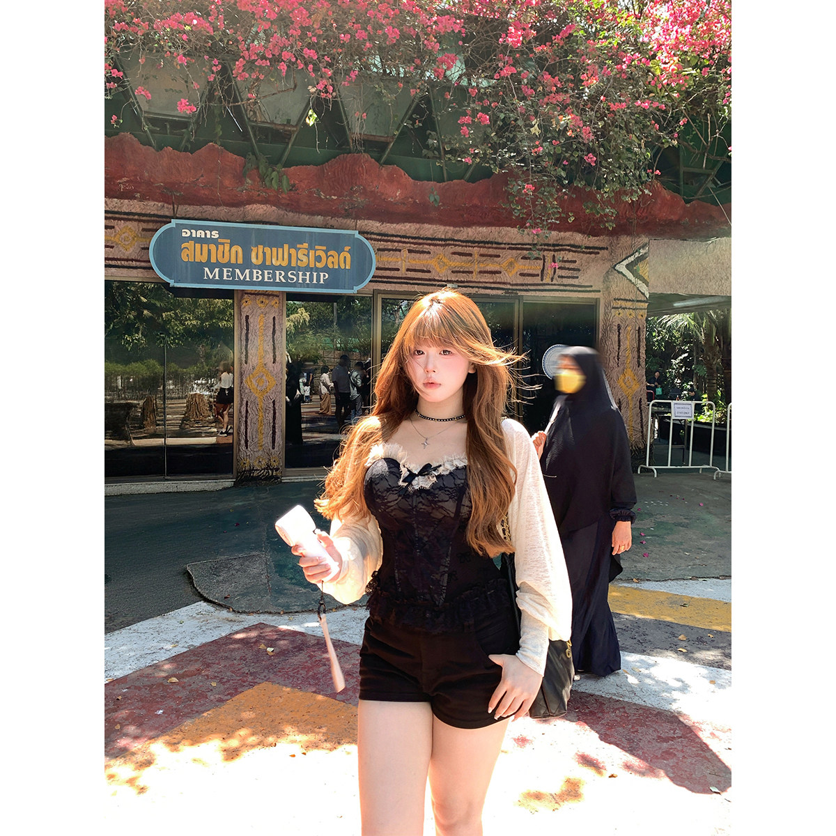 安妮不火 纯欲显瘦上衣 撞色蕾丝边蝴蝶结鱼骨塑形吊带女微胖大码