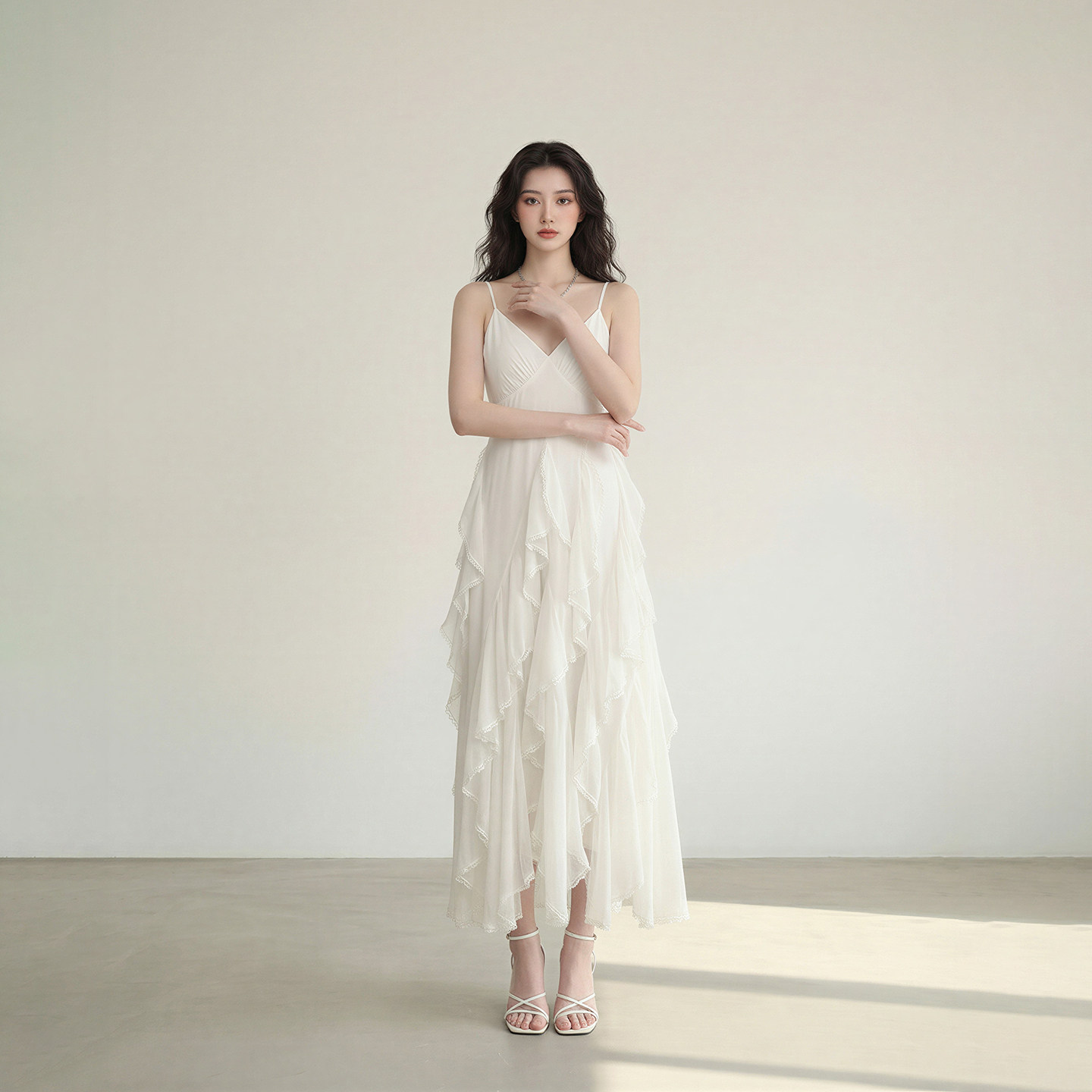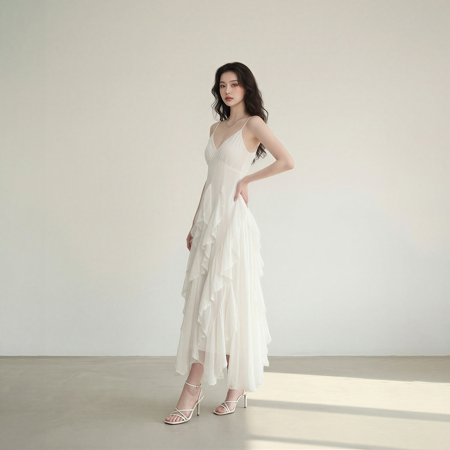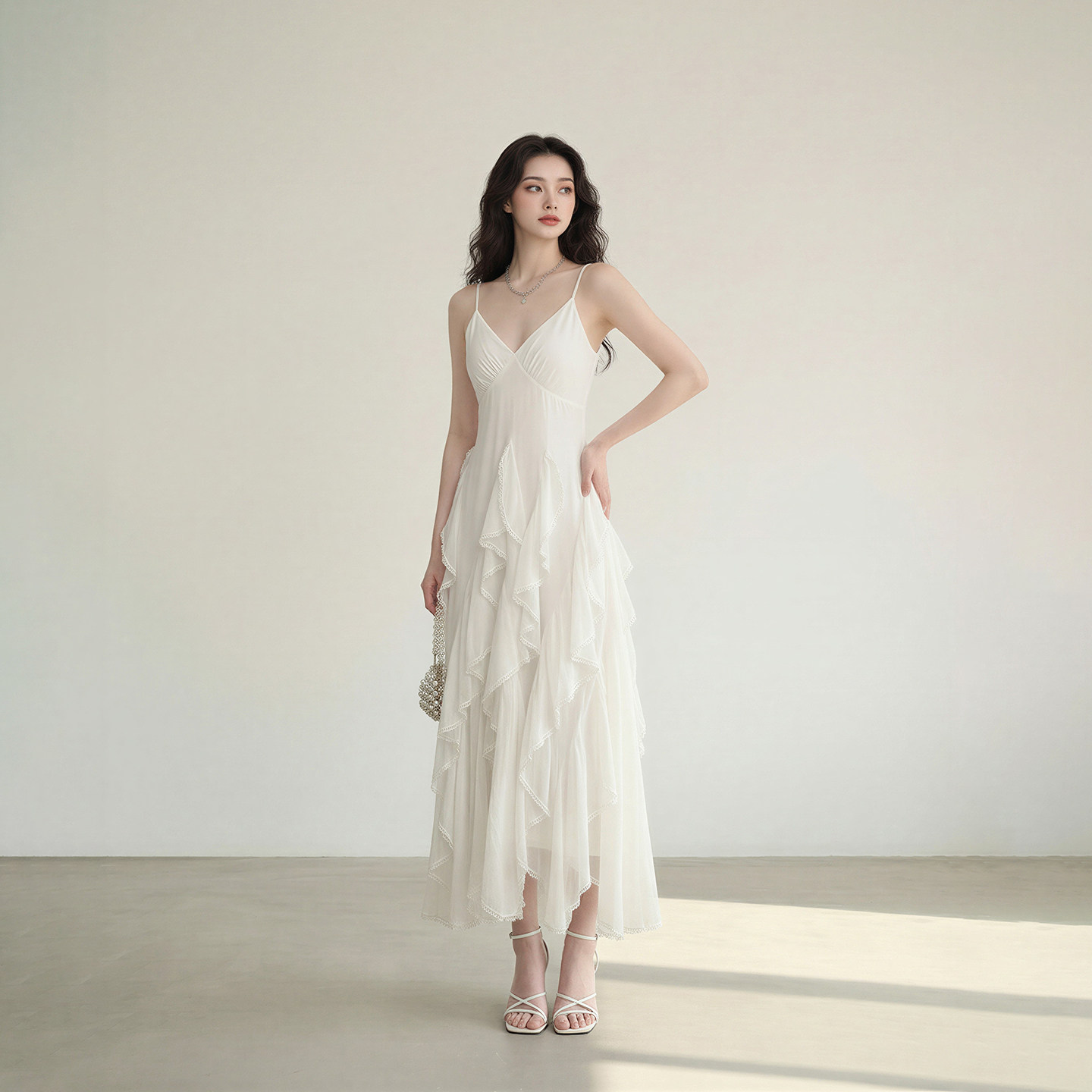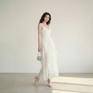 艾格法式 仙女白色吊带连衣裙女V领不规则荷叶边收腰显瘦百搭长裙