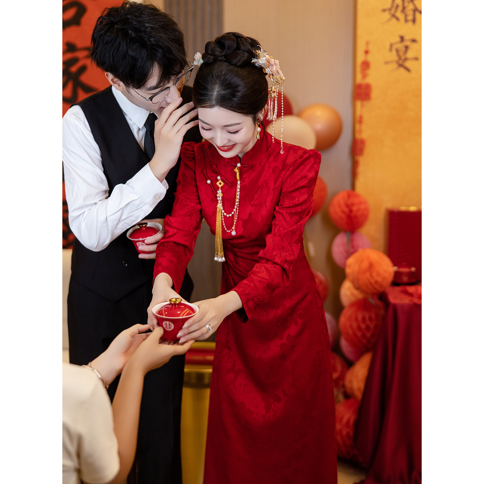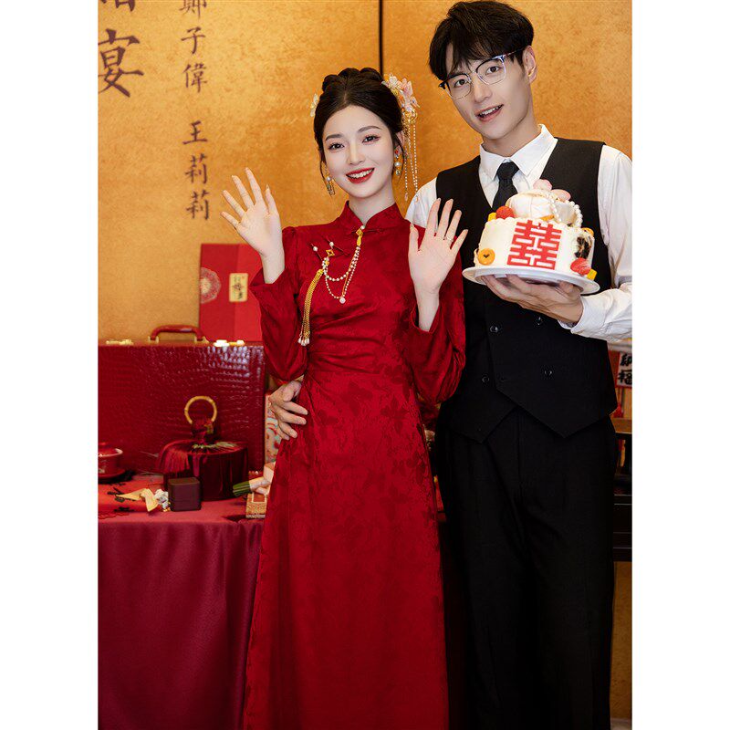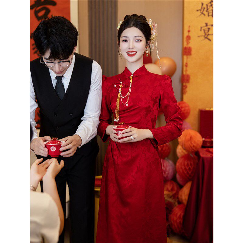 订婚礼服裙长袖 新中式 红色结婚便装 秋冬季 旗袍敬酒服新娘2024新款
