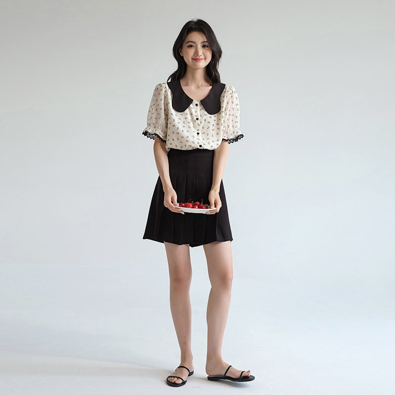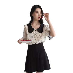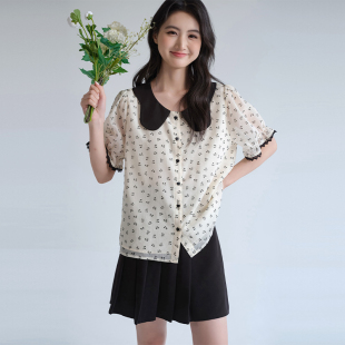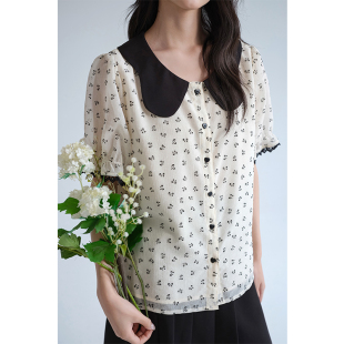 女装 胖mm巨显瘦法式 翻领蝴蝶结碎花雪纺衫 新品 上衣 夏季 蓝若水大码