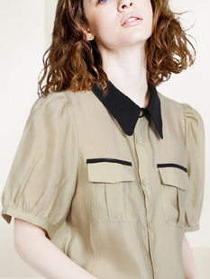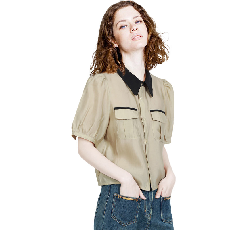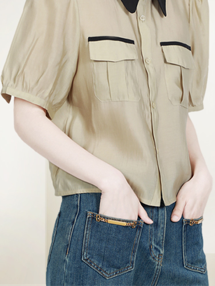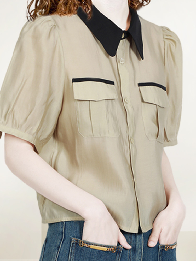 短袖 撞色复古泡泡袖 衬衫 新款 通勤减龄天丝上衣潮 女2026年夏装 法式