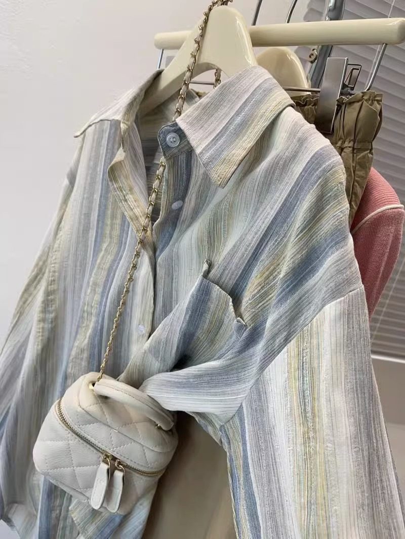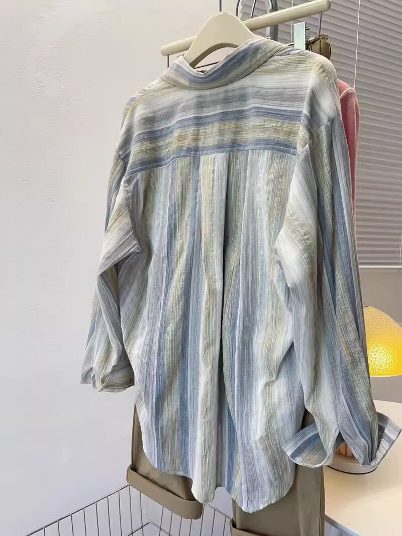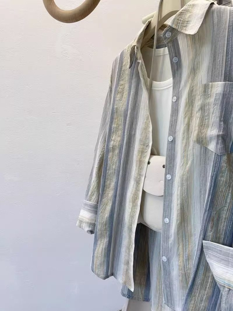 开衫 轻奢高档薄款 宽松大码 女2024夏新款 外套衬衣服 条纹防晒衣衬衫