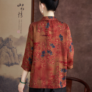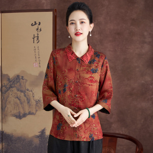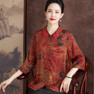 中老年女妈妈开衫 洋气翻领香云纱真丝上衣宽松减龄衬衫 夏新款