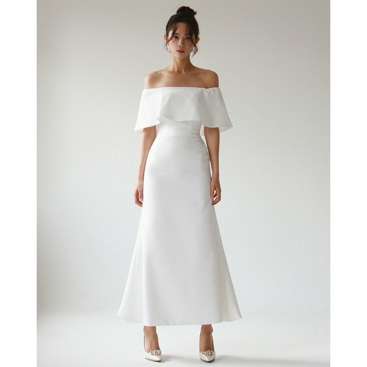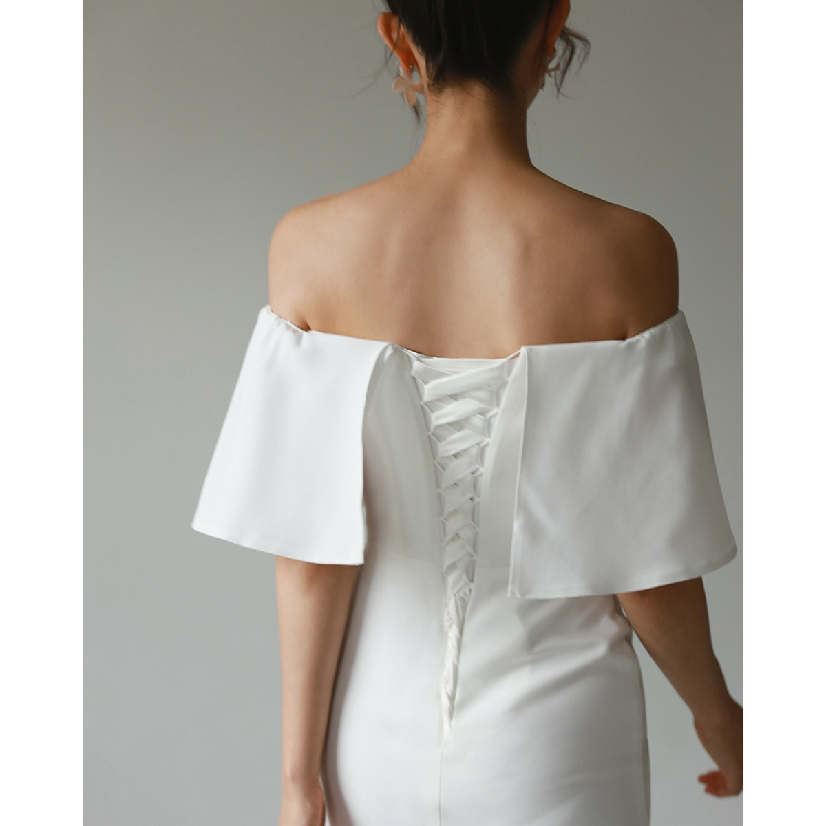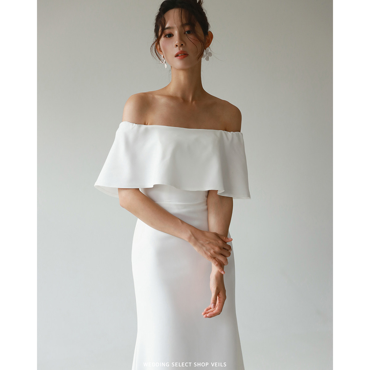 Veils简约新娘轻婚纱白色复古荷叶边一字肩高腰包臀鱼尾显瘦气质