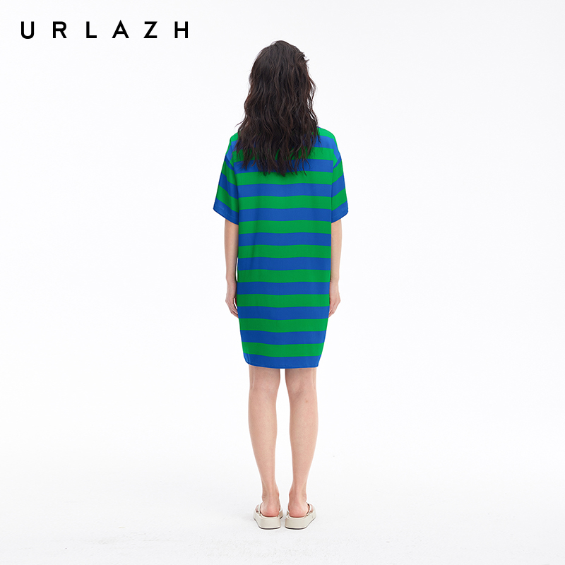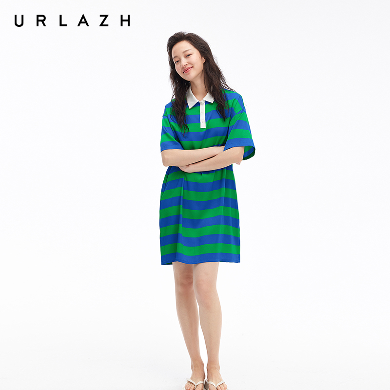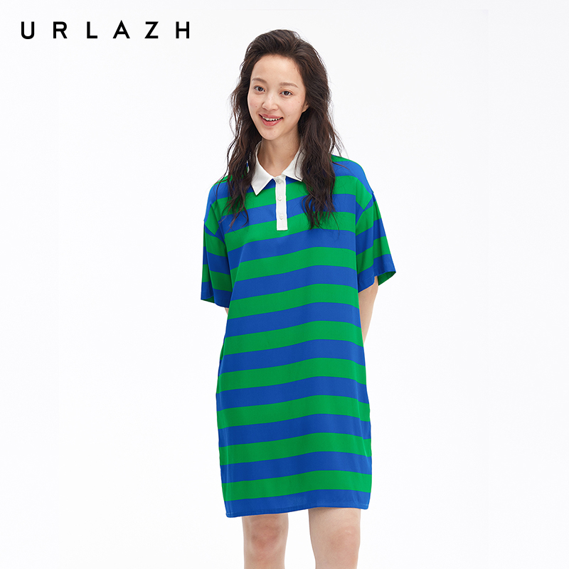 URLAZH有兰夏季 蓝绿条纹撞色桑蚕丝polo领休闲直筒宽松连衣裙 新款