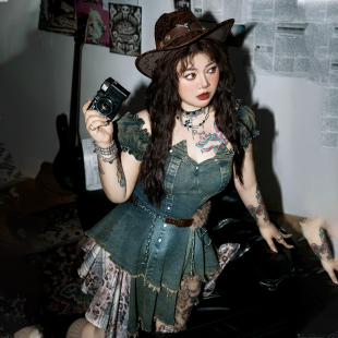 夏季 硬糖大码 甜酷辣妹风牛仔连衣裙短款 蓝色牛仔 原创