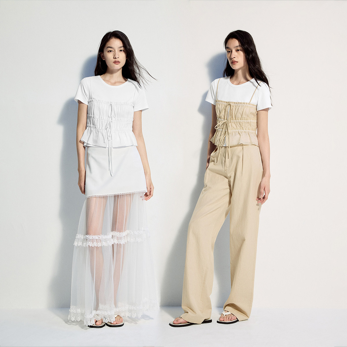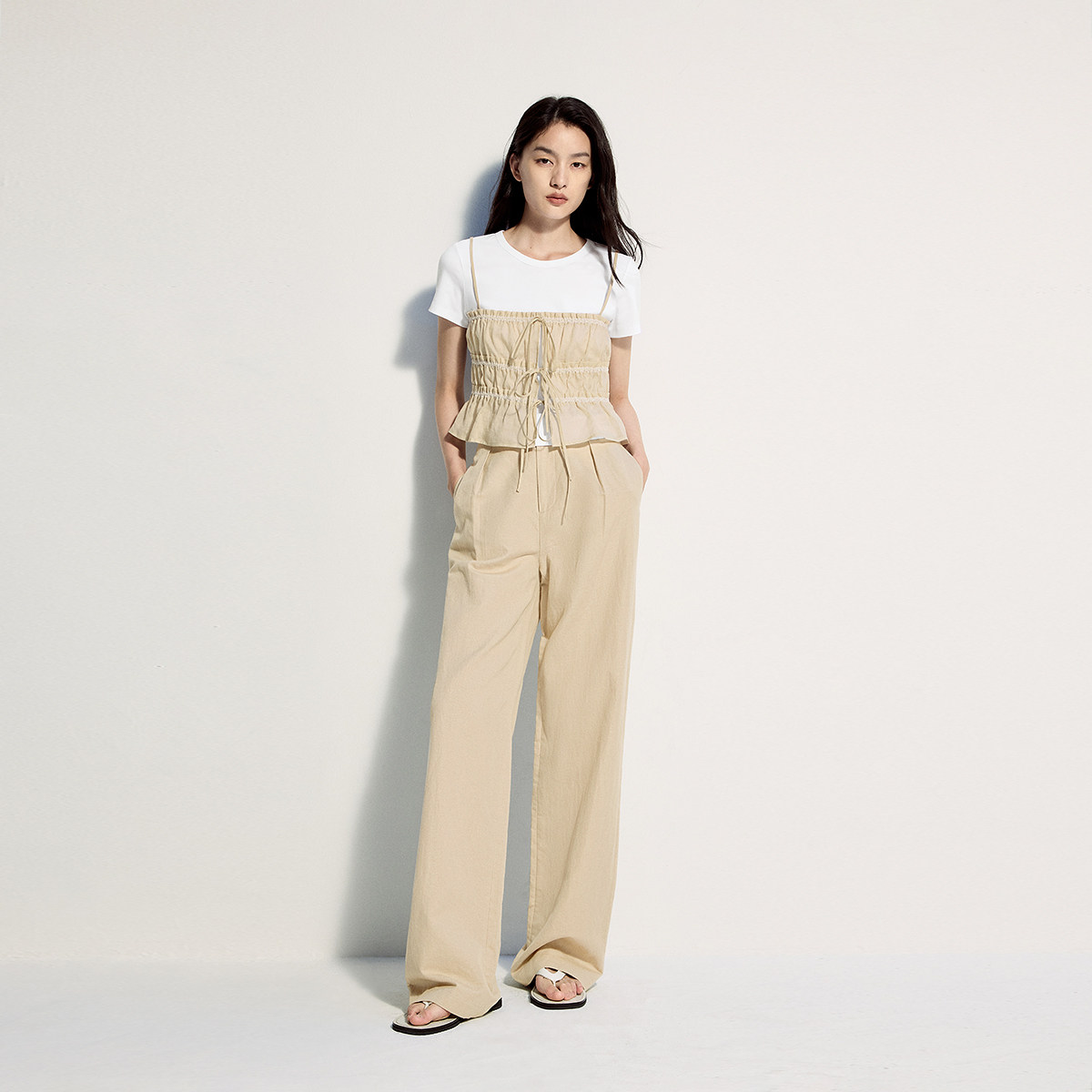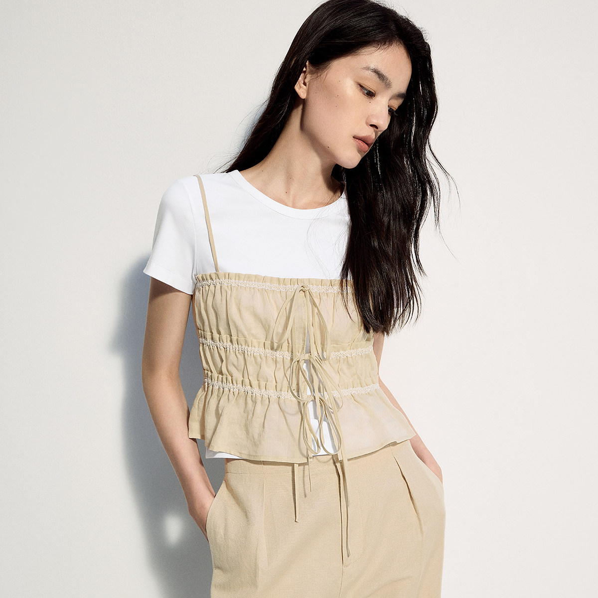 OCHIRLY欧时力 t恤配系带背心设计感高级夏 丝光圆领短袖