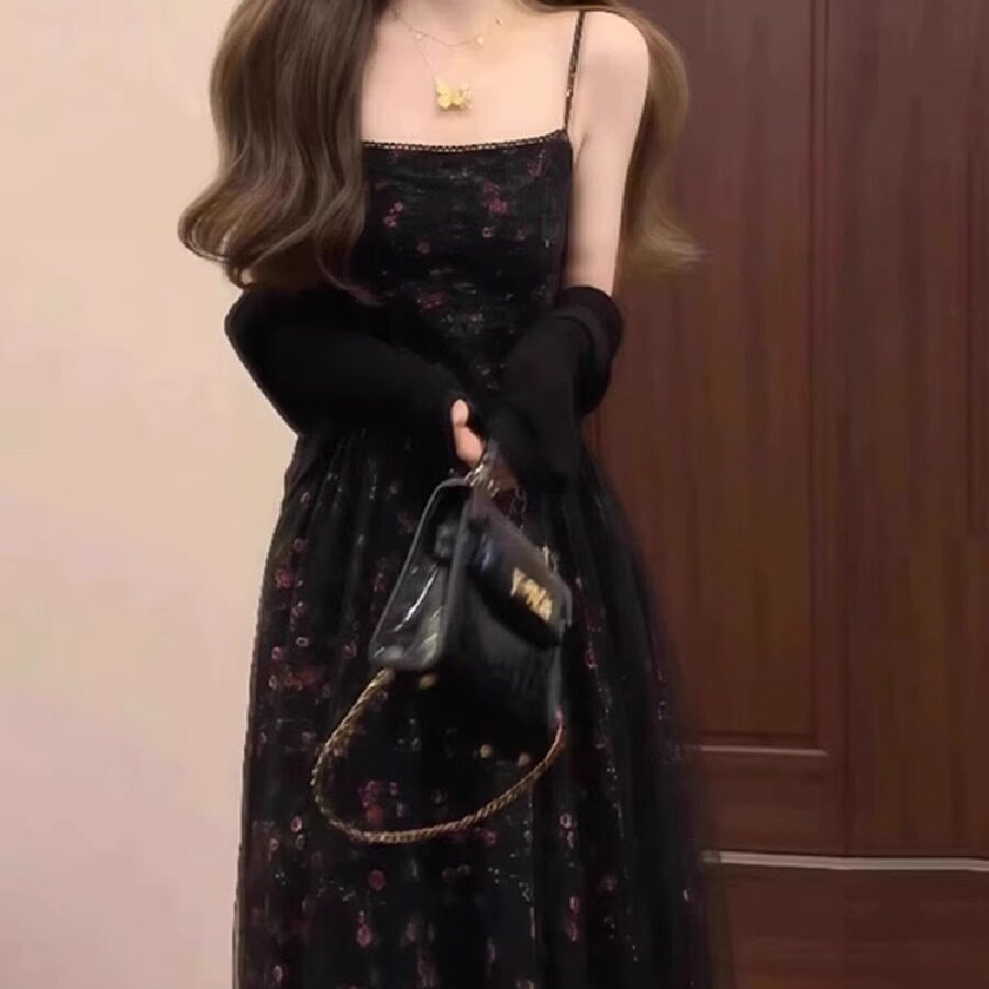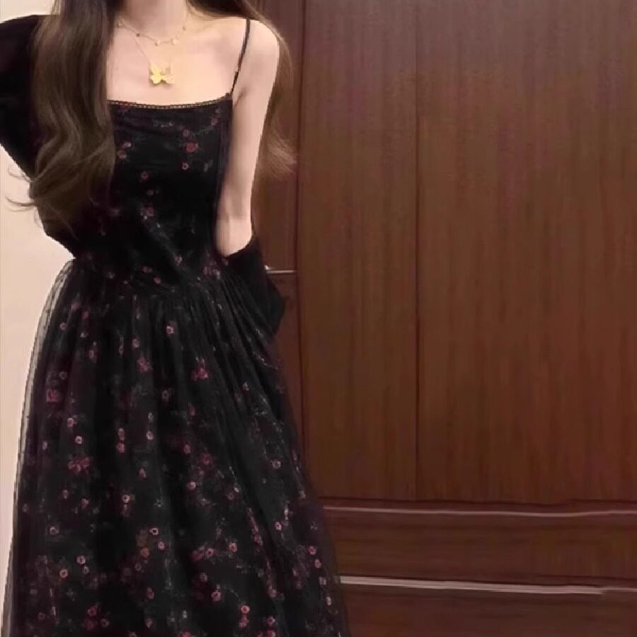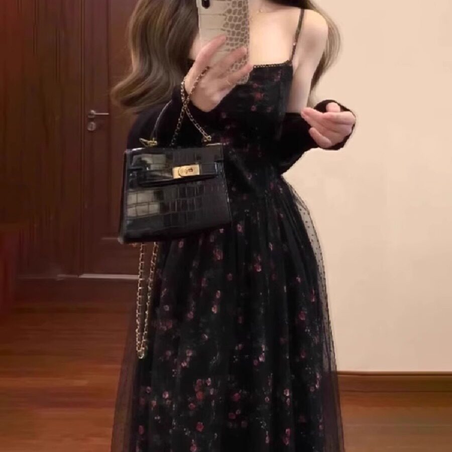 大码 女夏显瘦两件套 胖mm纯欲网纱拼接收腰黑色碎花吊带连衣裙开衫