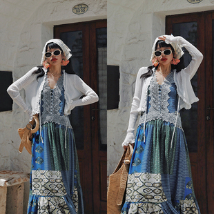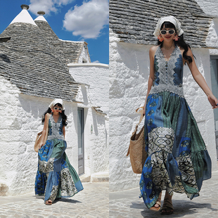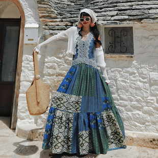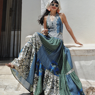 波西米亚度假风V领挂脖蓝绿印花连衣裙 法式 麦叙原创 花枝雀羽