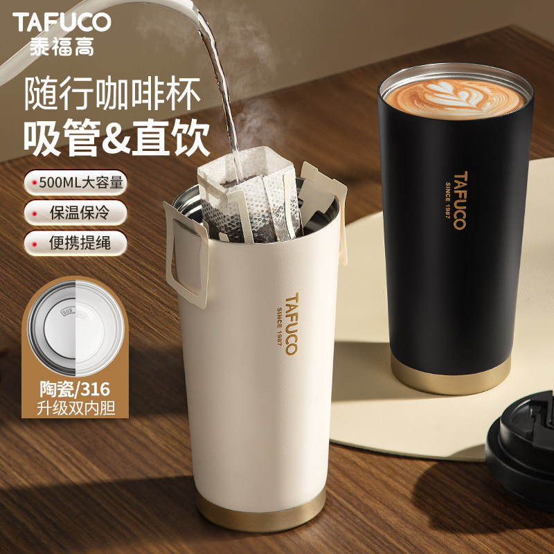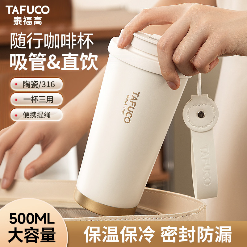 日本泰福高保温杯陶瓷内胆咖啡杯女高颜值随行吸管水杯子2026新款