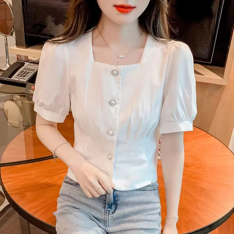 小个子收腰短款 方领短袖 夏天2025新款 女款 上衣设计感小众 雪纺衬衫