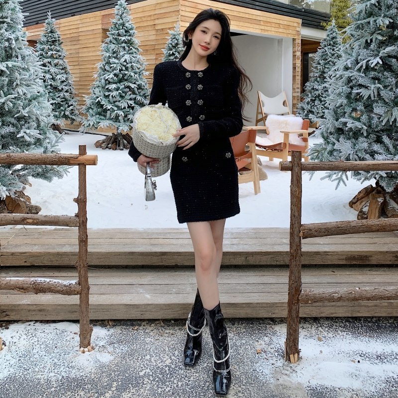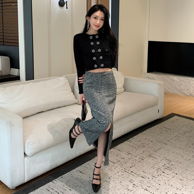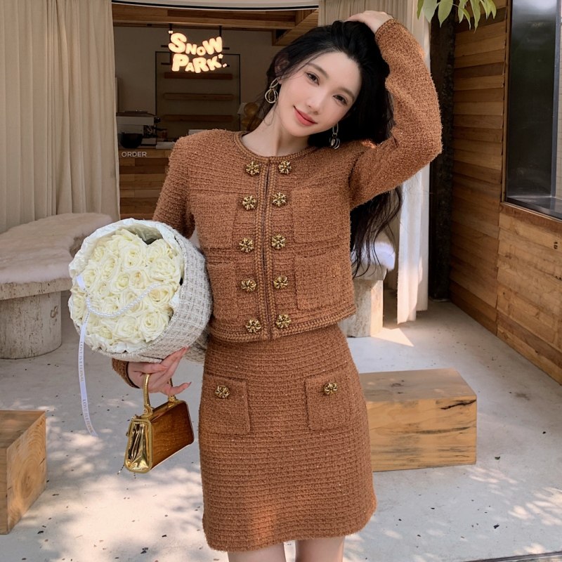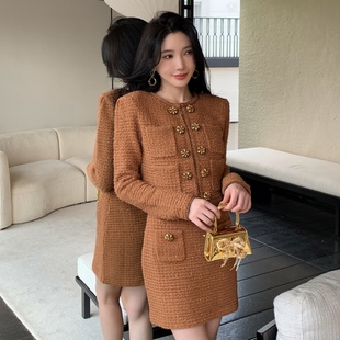 高腰短裙子美拉德小香风套装 富家千金双排扣毛衣针织长袖 外套开衫