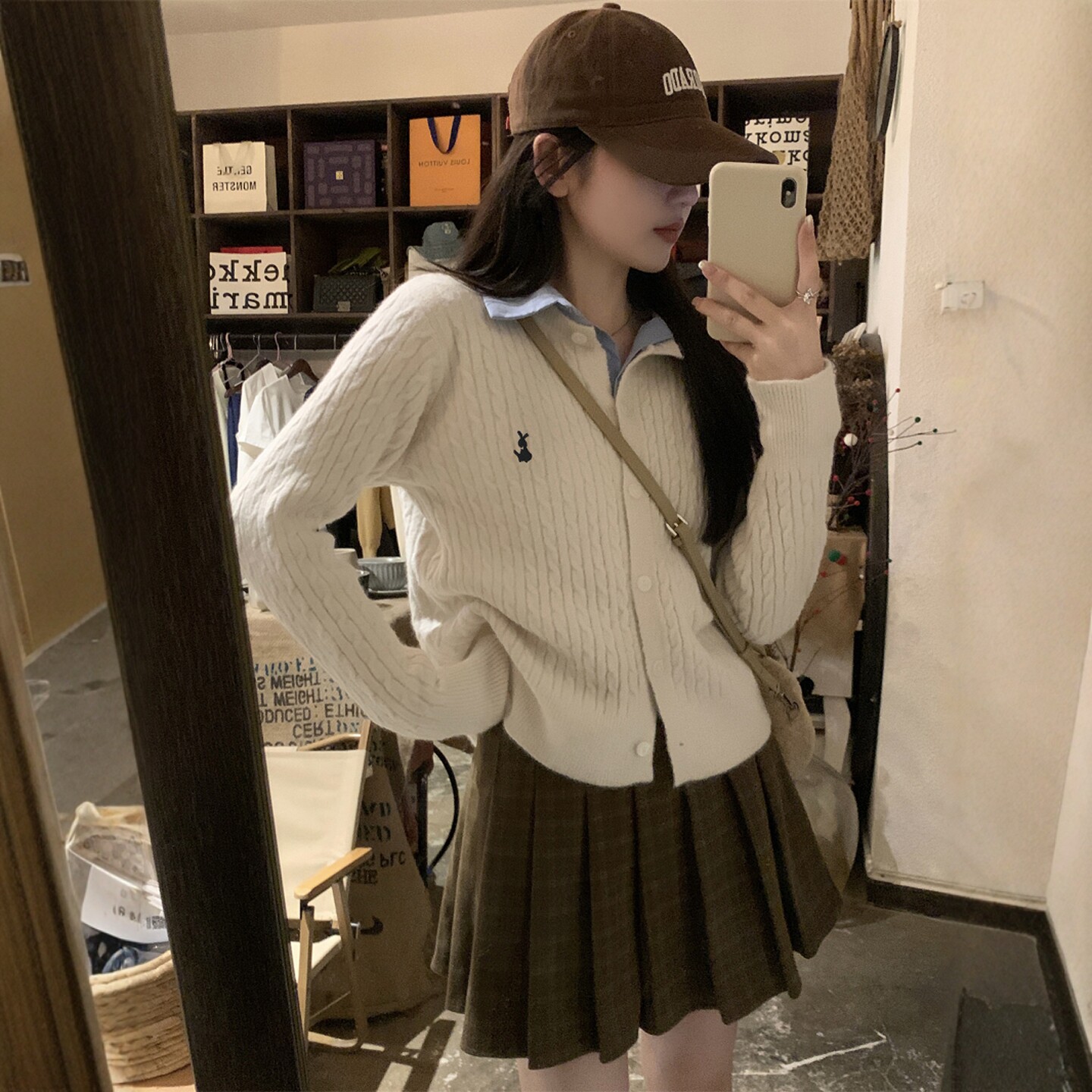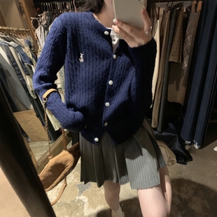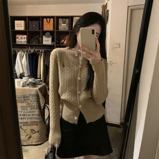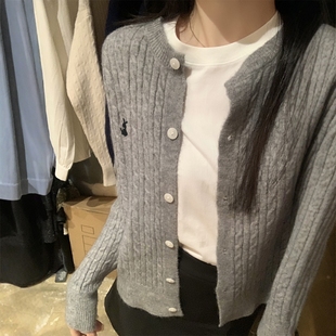 秋冬季 女韩系miu系穿搭刺绣上衣灰色毛衣外套 单排扣麻花针织开衫